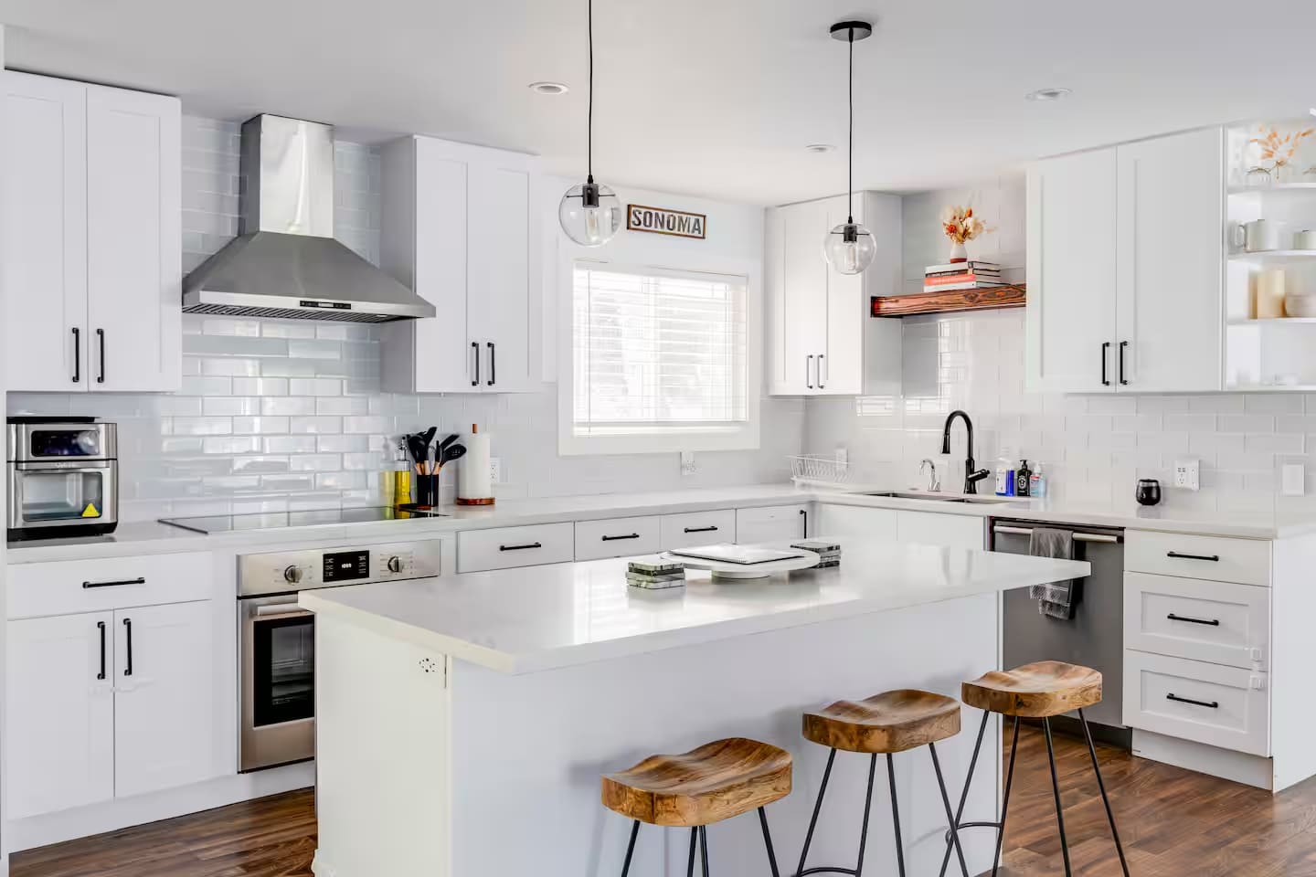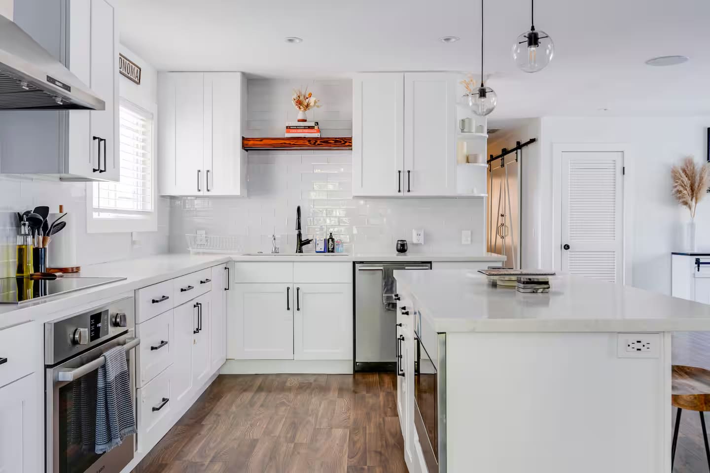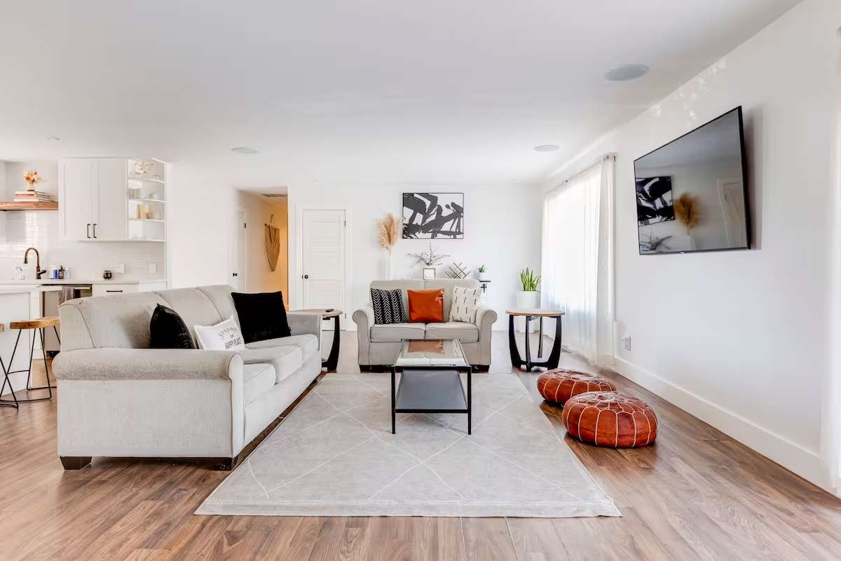 The living room invites you to cozy up on the sofa for a movie night, unwind with a glass of wine, or play some games in front of the large windows showcasing the beautiful backyard. For your comfort, there's central heating and cooling (AC). The open floor plan extends into the kitchen and dining area. The fully stocked, gourmet kitchen is designed for entertaining, featuring bar seating at the island and an open view into the living room. You'll find everything you need to prepare memorable meals, well-equipped with modern appliances, a coffee maker, and all the essentials.
