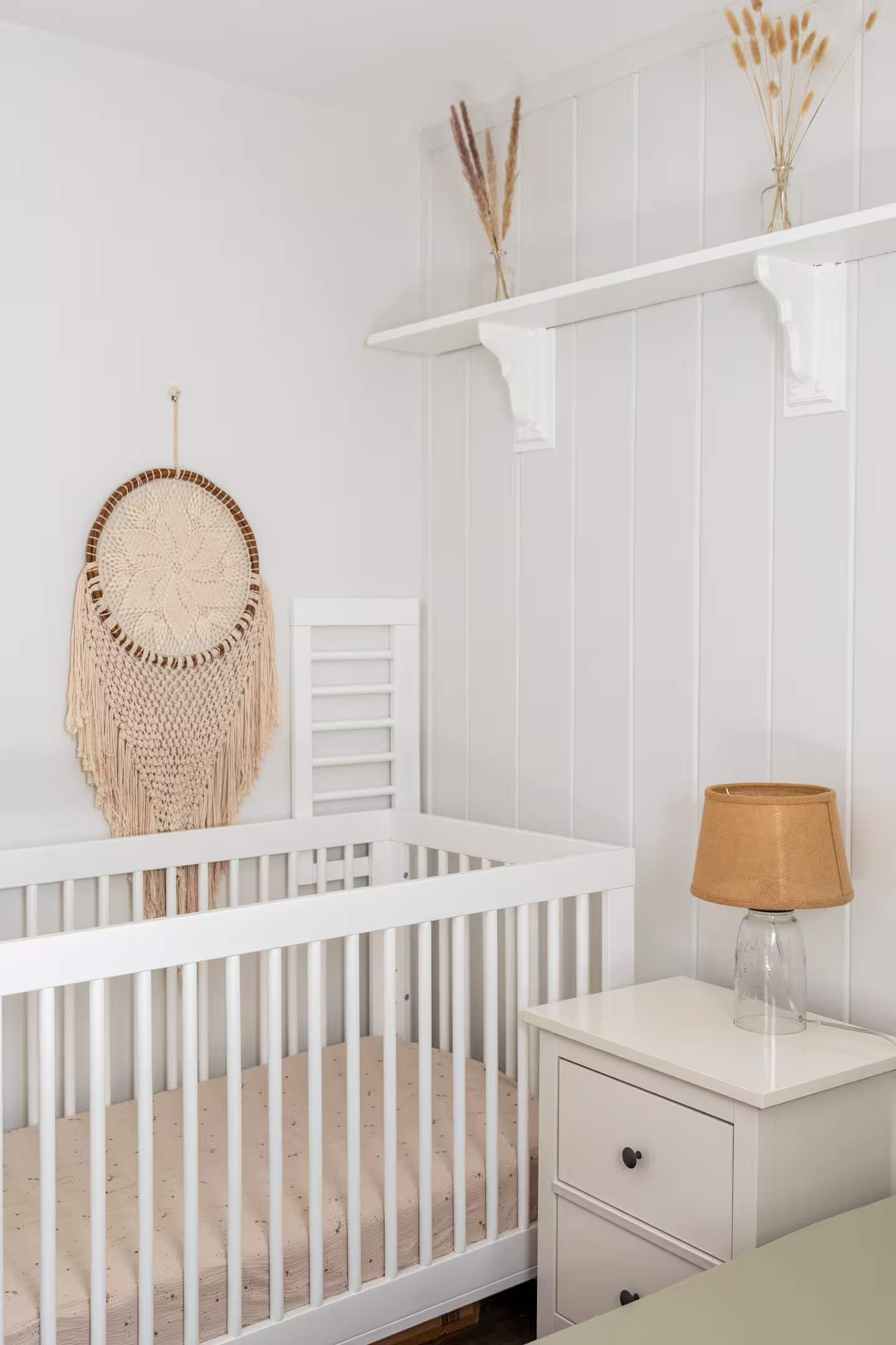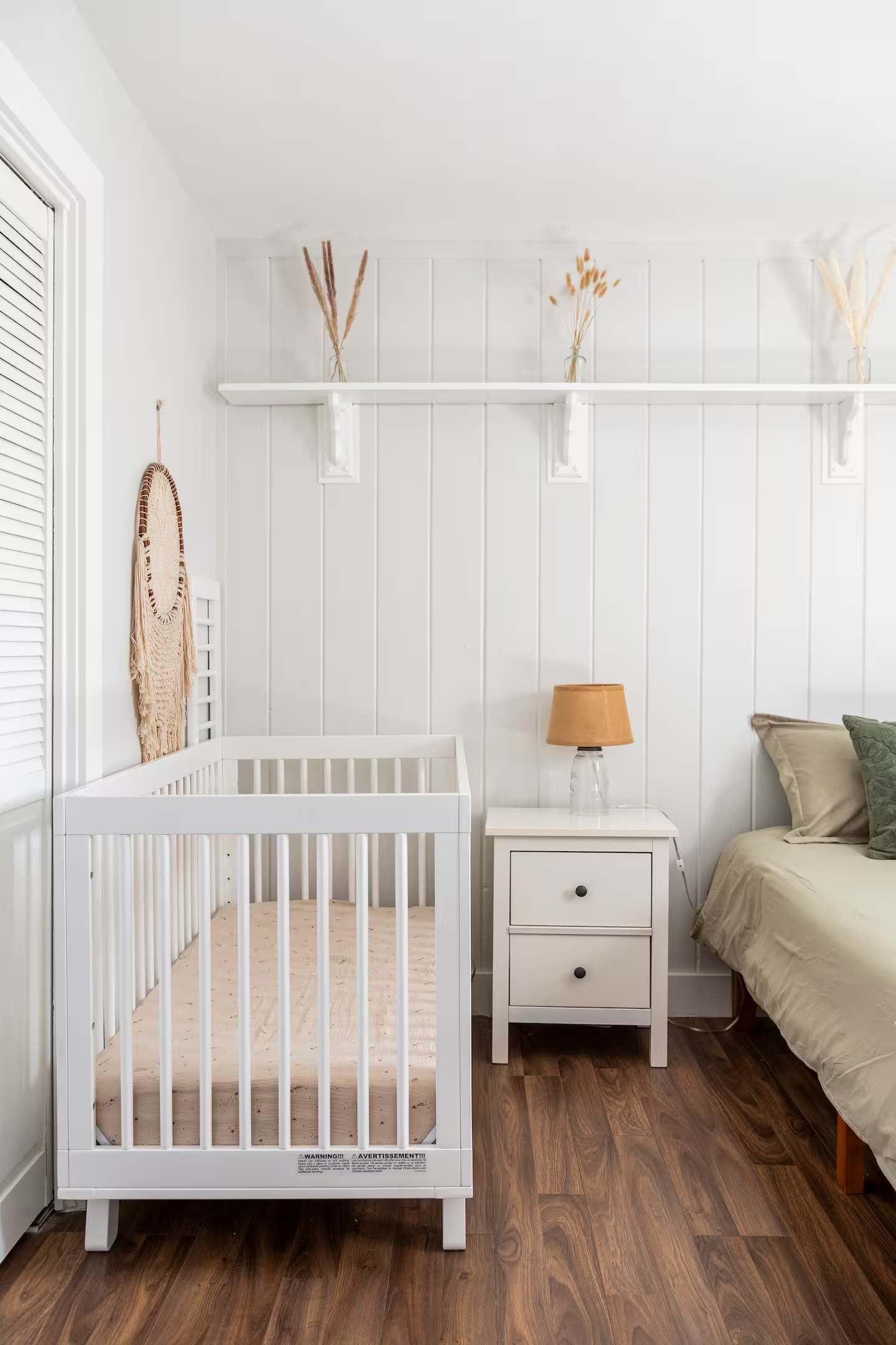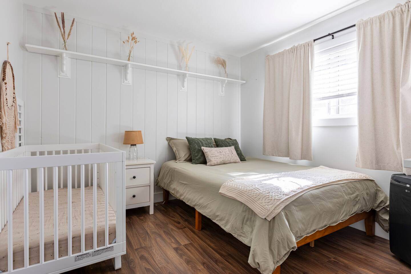 The third bedroom has a queen-sized bed, a bedside dresser, and a baby crib, making it a flexible space for families. Tastefully decorated with organic elements, this room is a breath of fresh air.