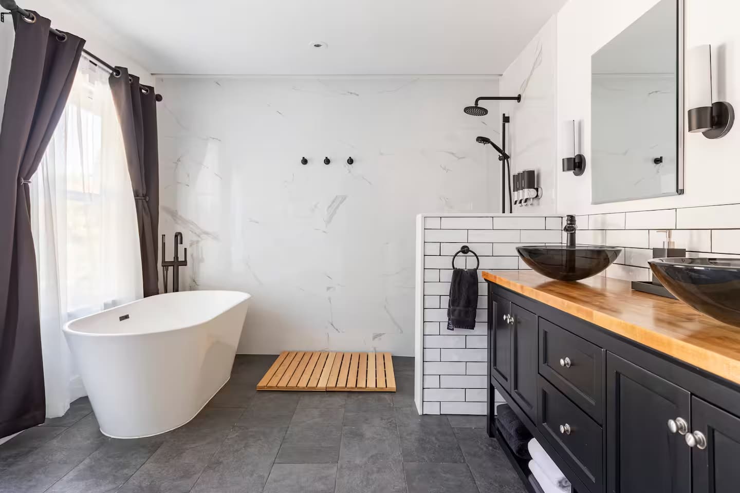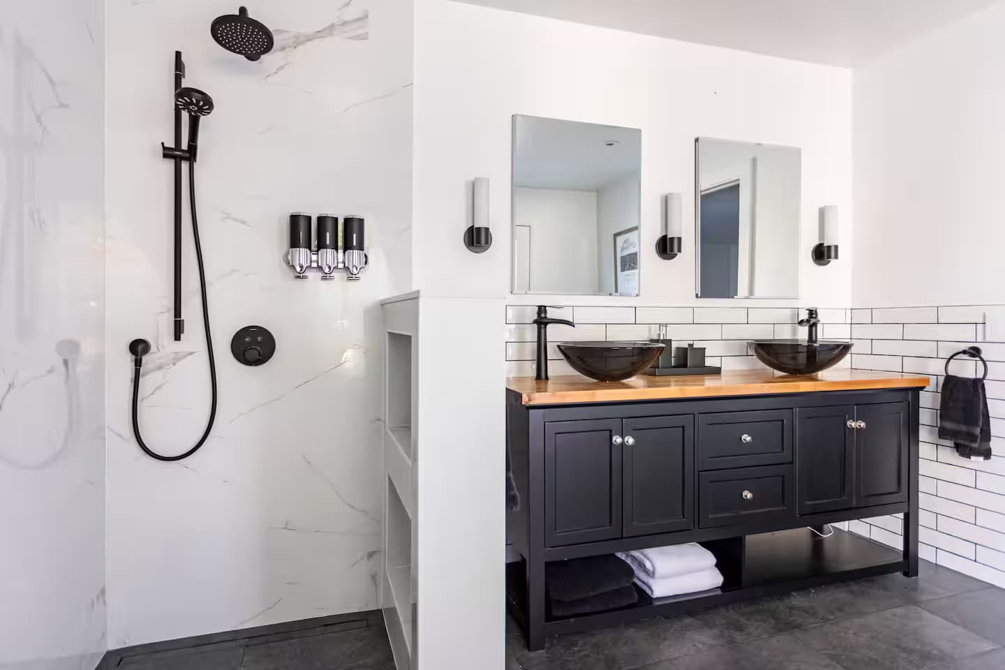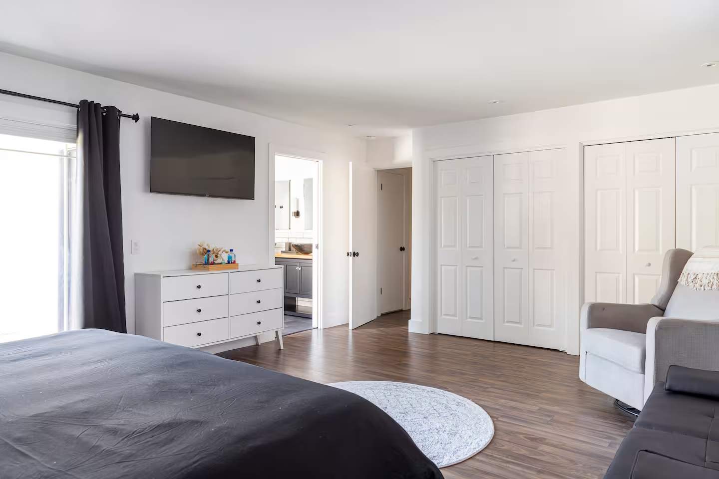 The primary bedroom features a king-sized bed, a cozy seating area, a fold-down futon, a TV, a full dresser, and an ensuite bathroom. The ensuite boasts a double vanity, a walk-in shower, a deep soaking tub, and a clean, modern feel.
