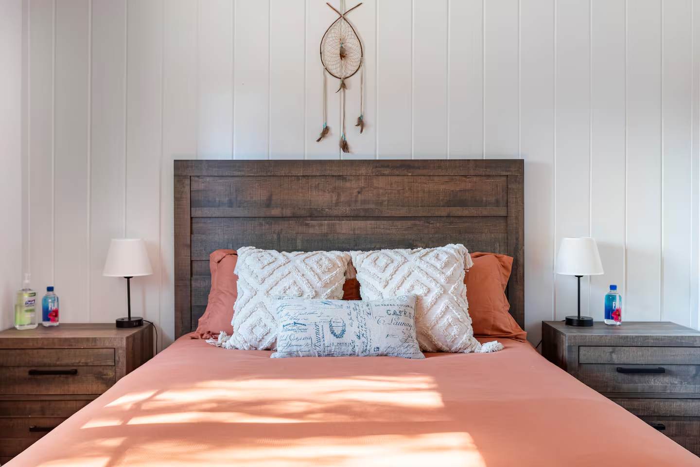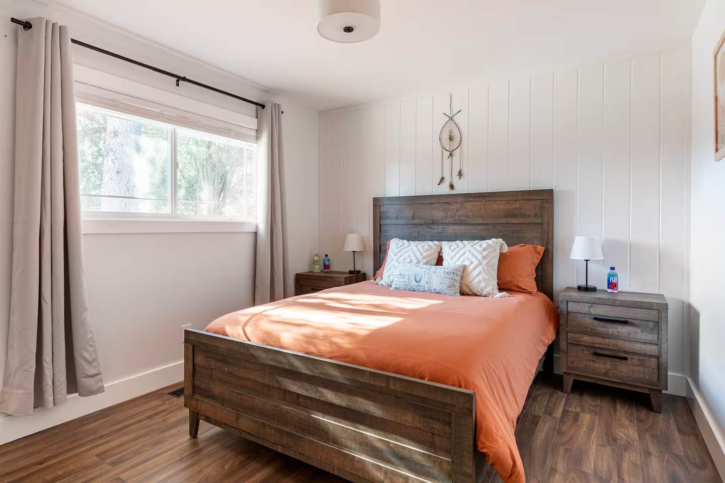 The second bedroom offers a queen-sized bed, bedside dressers, and is decorated with rustic country charm.