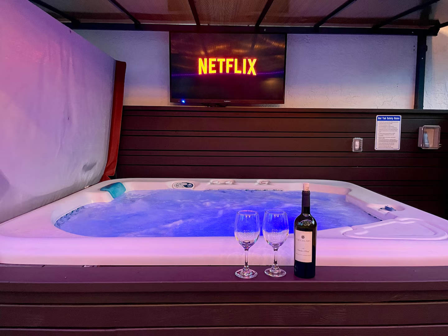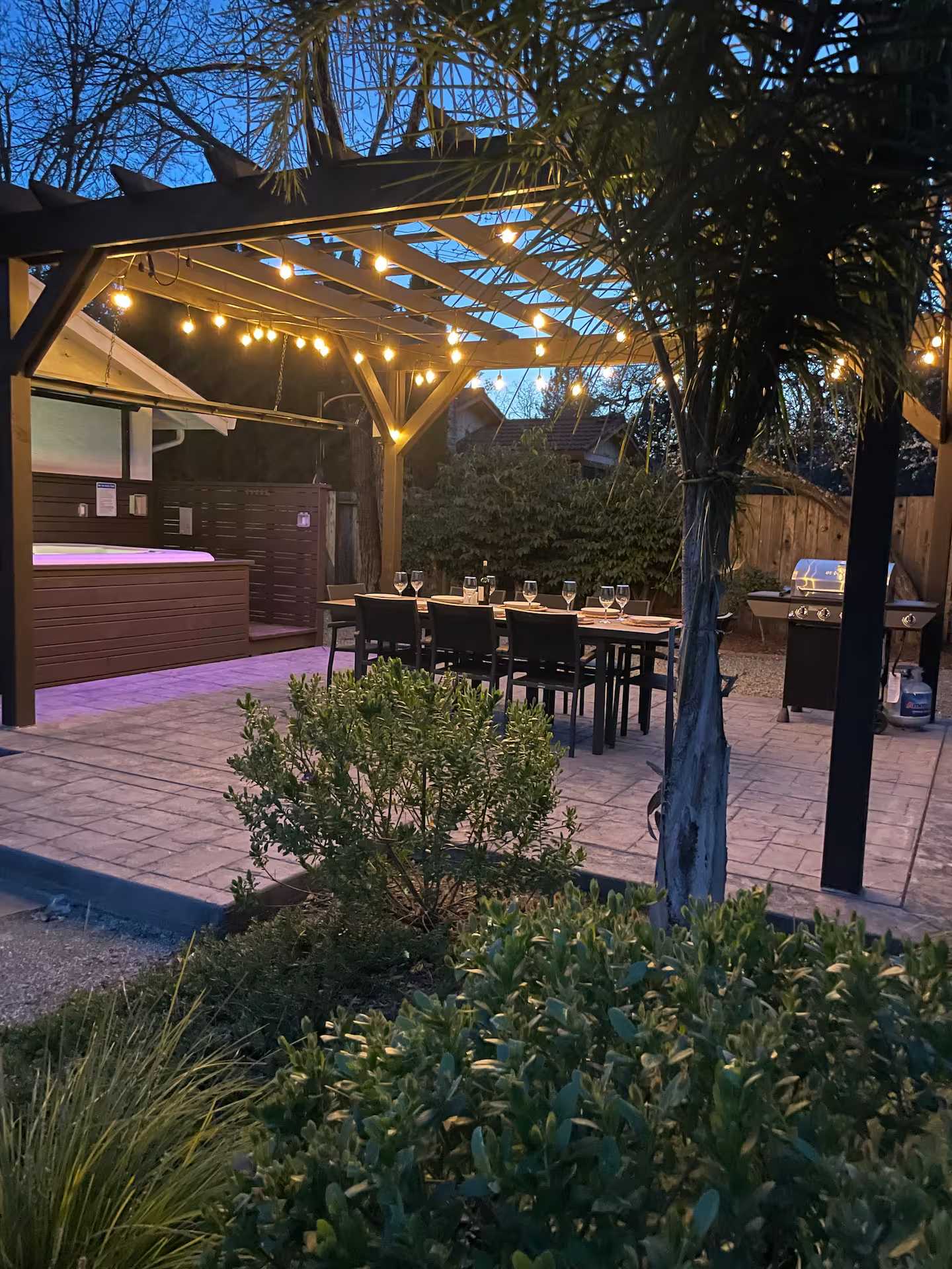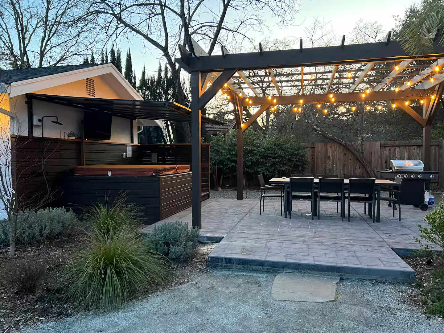 Outside you'll find a private patio with ample seating, an outdoor dining table, a fire pit, BBQ grill, and a covered hot tub with a TV! It's perfect for sipping wine under the stars or watching the ball game while soaking in the hot tub. The front portion of the backyard is newly landscaped, very spacious, and peaceful! The back part of the yard runs more natural and a little wild, adding to the charm.