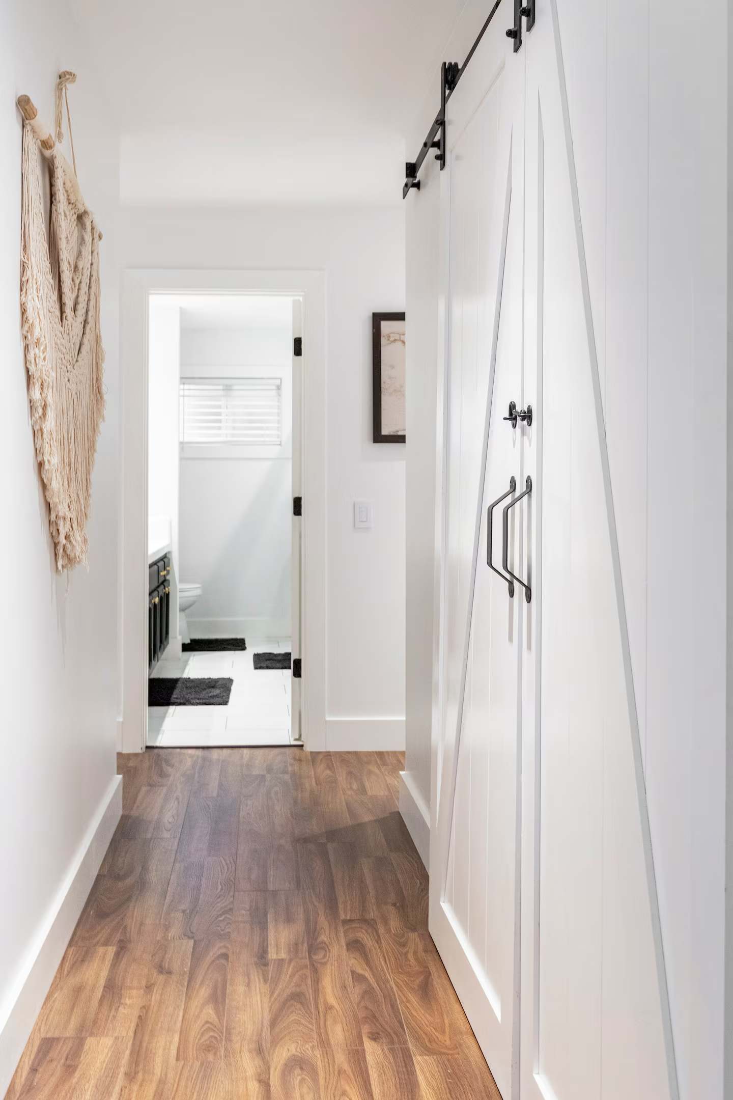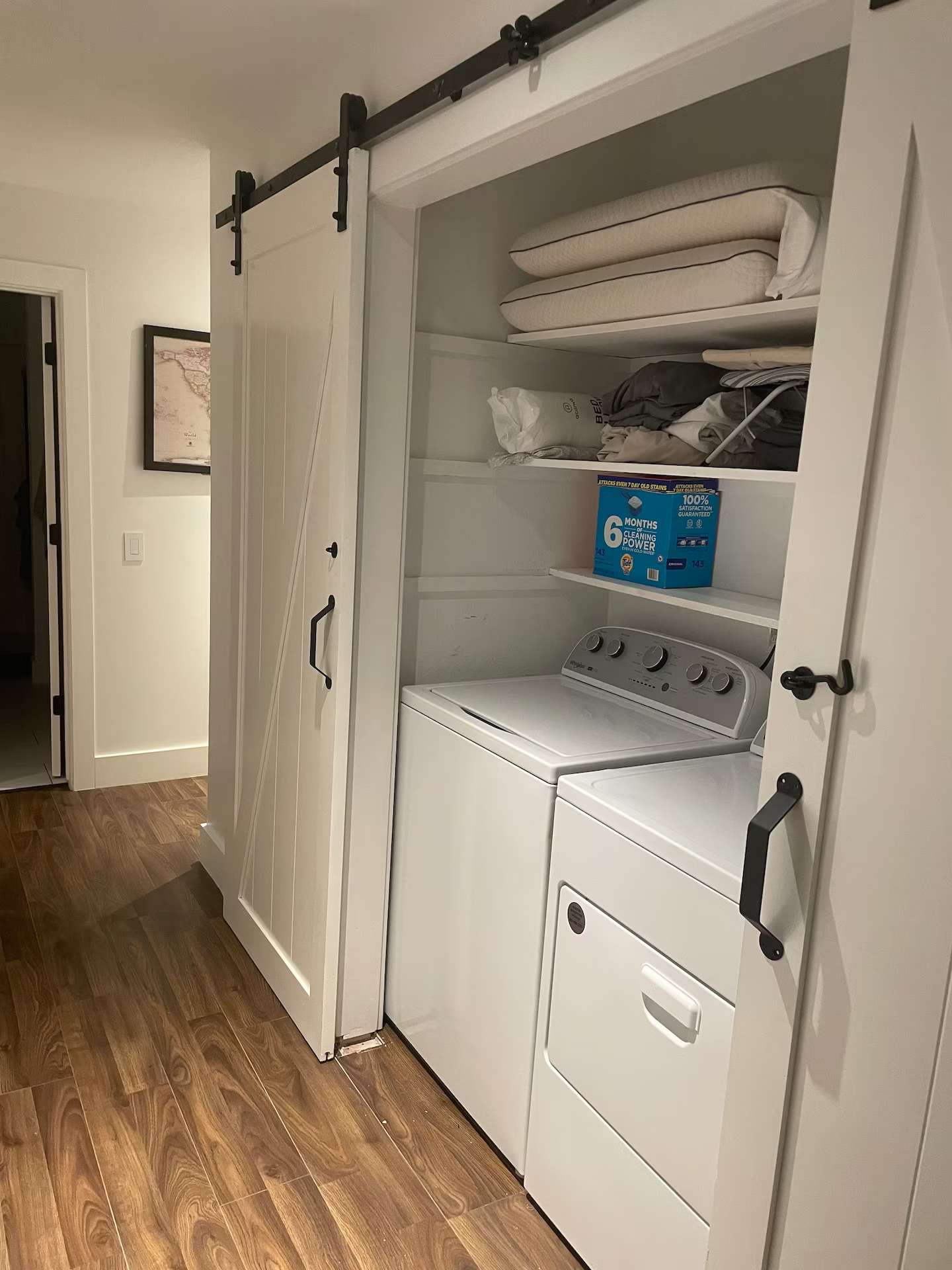 Laundry facilities are conveniently located in the hallway, featuring a full-sized washer and dryer, including free and clear detergents and scent-free softeners.