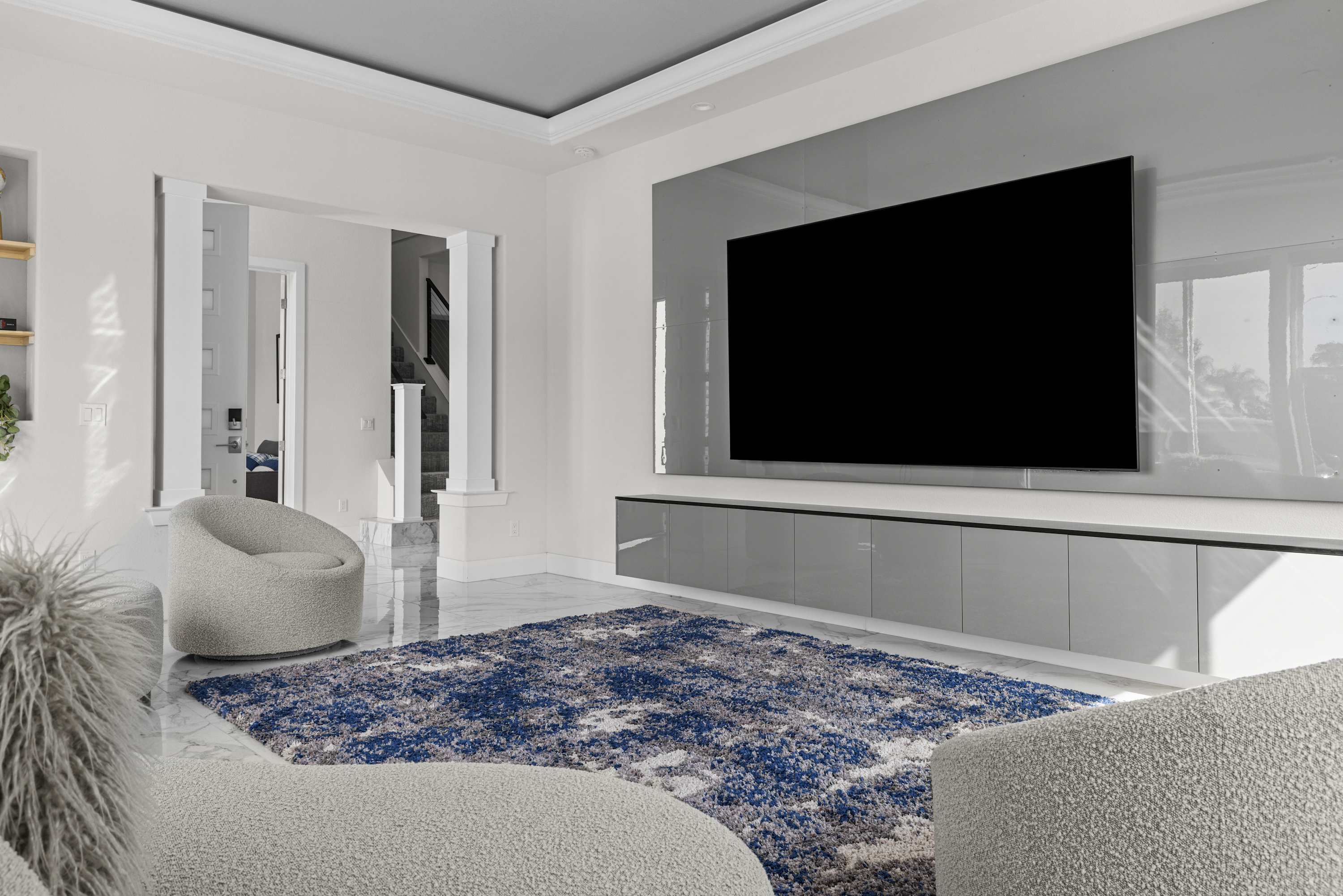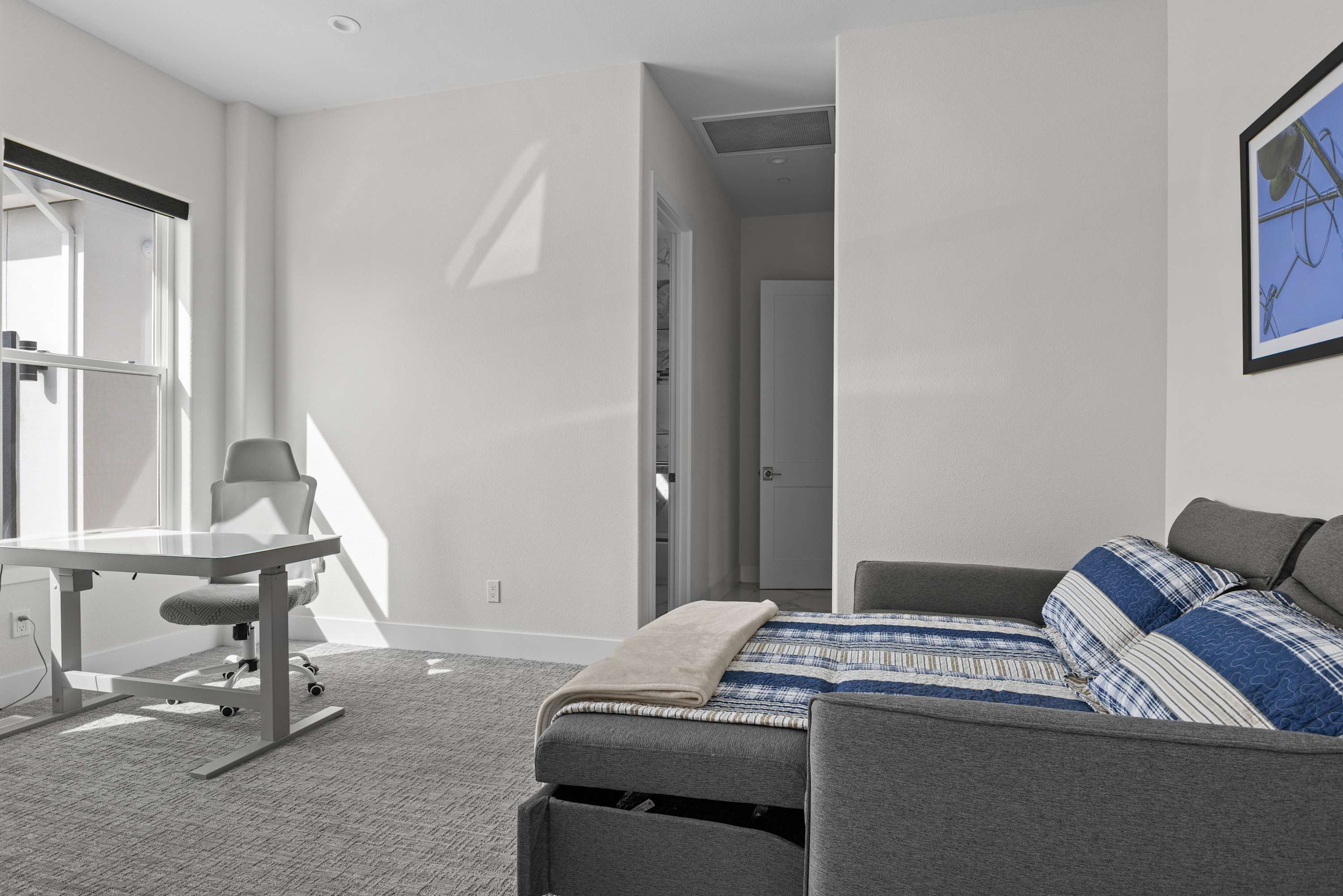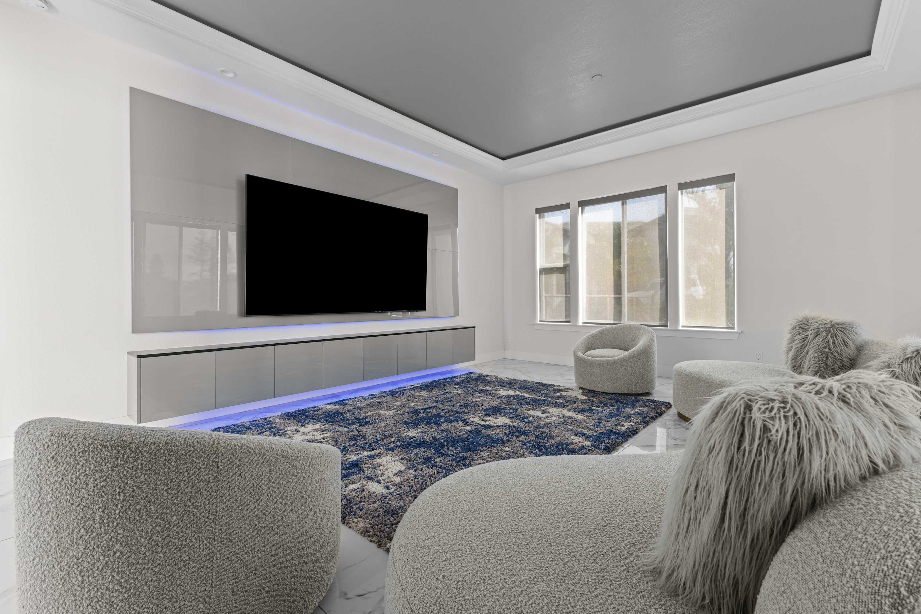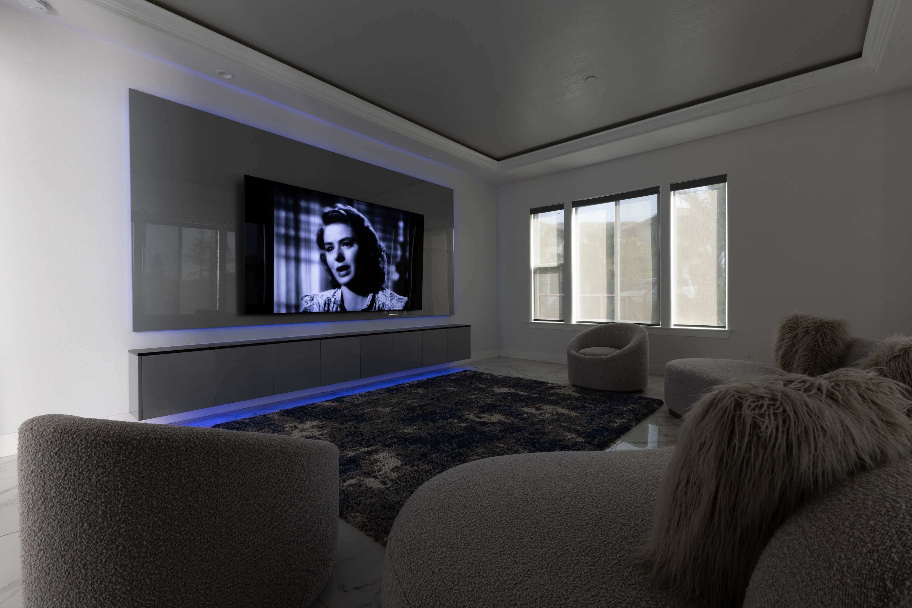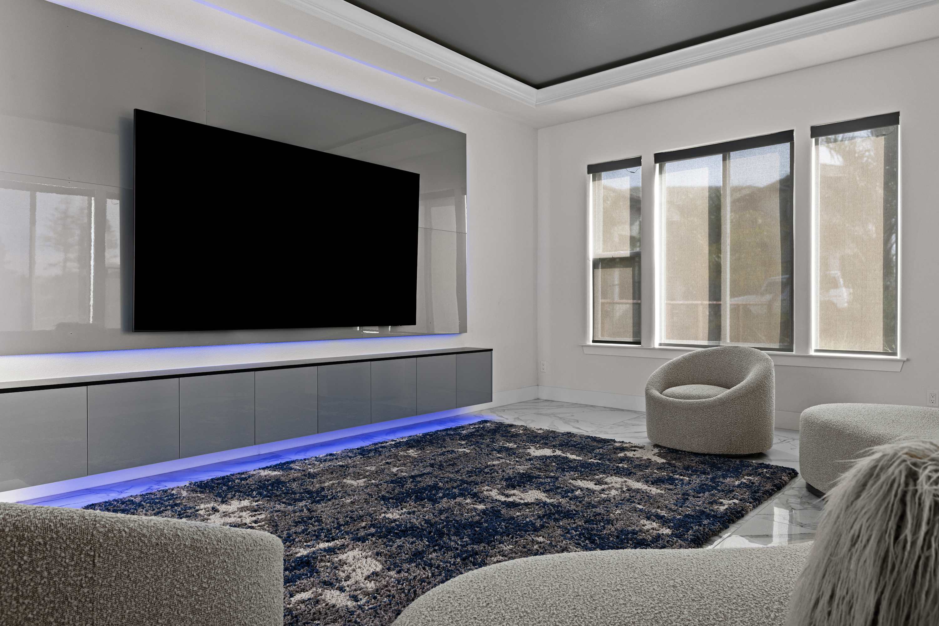 The main level also features an expansive, theater-like media room designed for the ultimate cinematic experience. The space features curated decor, an extra-large sofa, customizable lighting, and room-darkening shades. Nearby, a dedicated office provides an ergonomic workspace and a queen-sized fold-out couch, located conveniently next to a private bathroom and the home's laundry room with a high-efficiency washer and dryer.