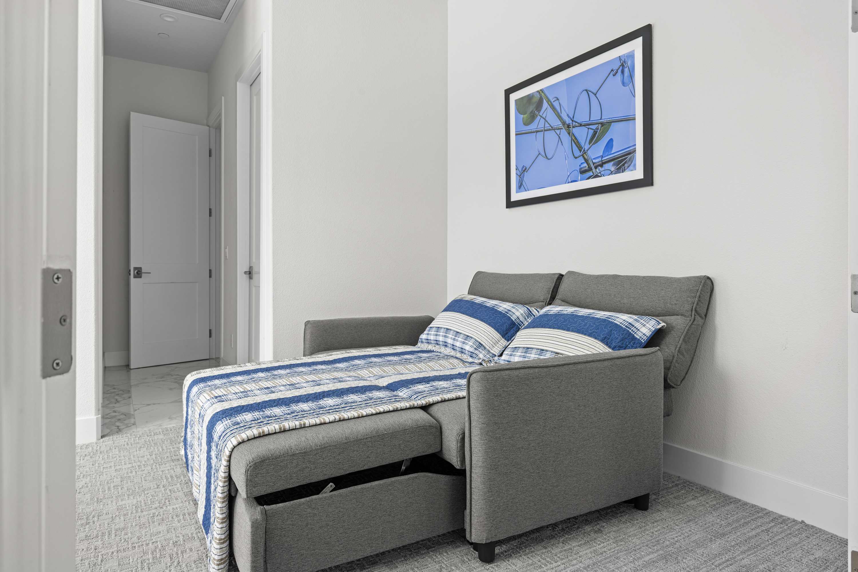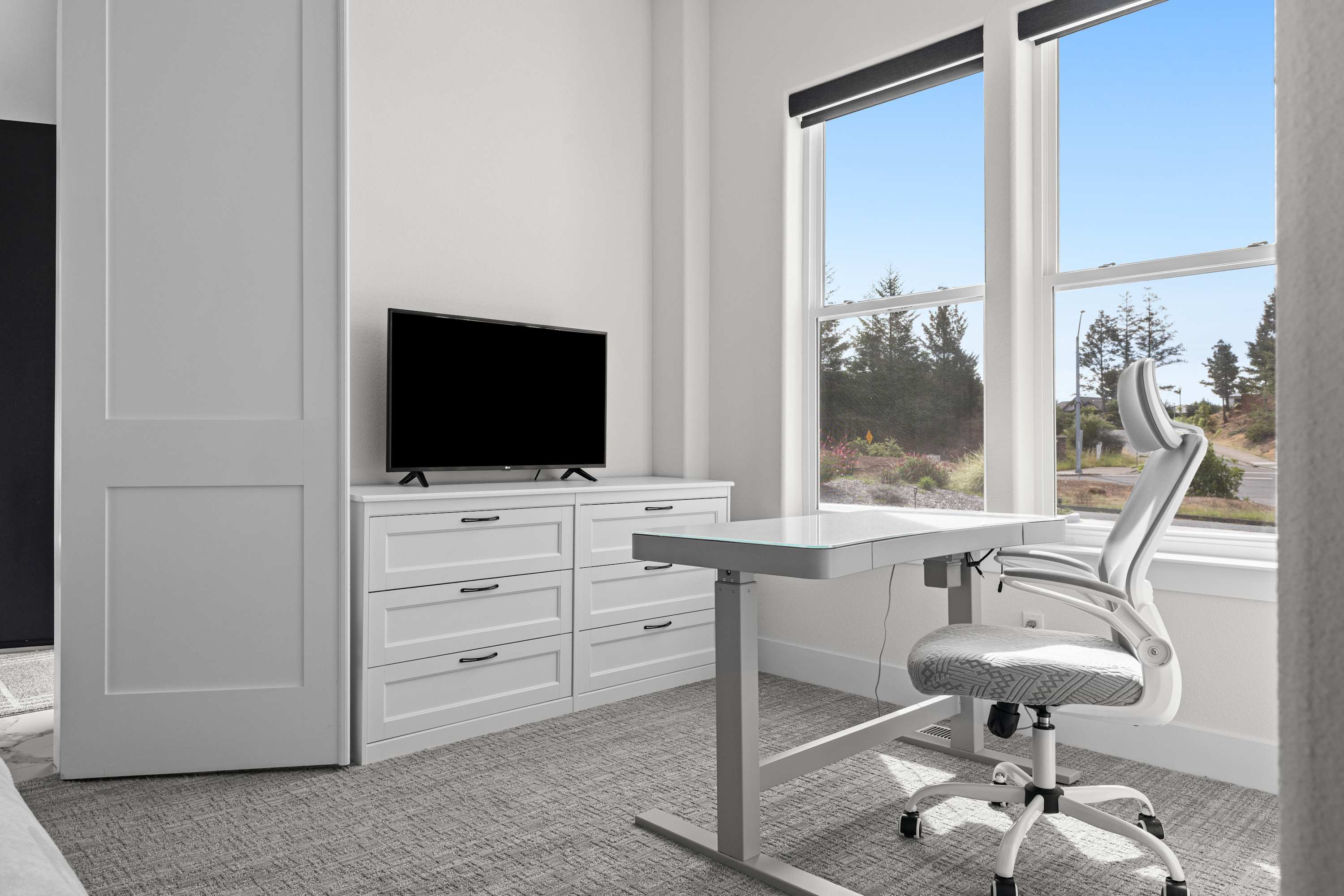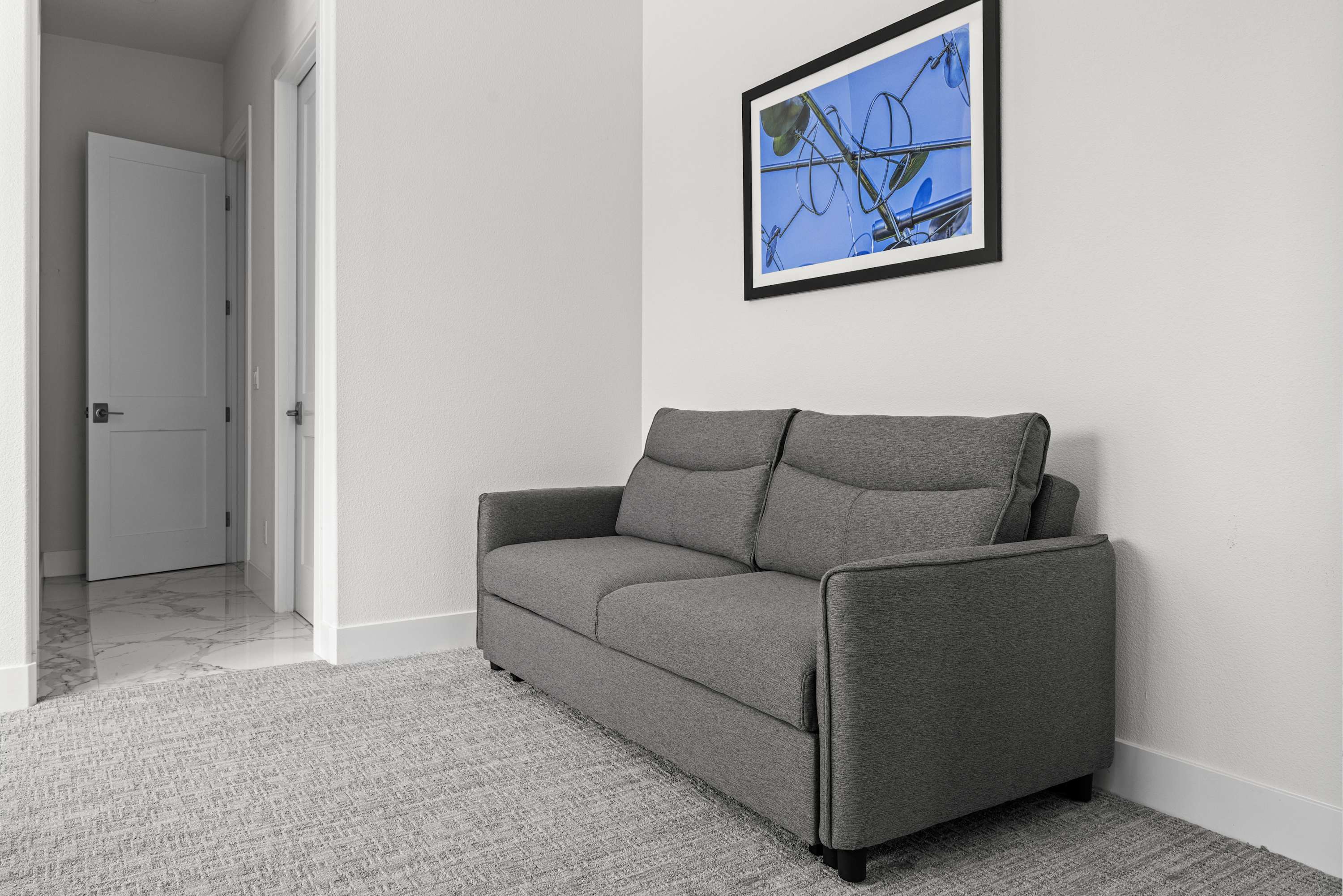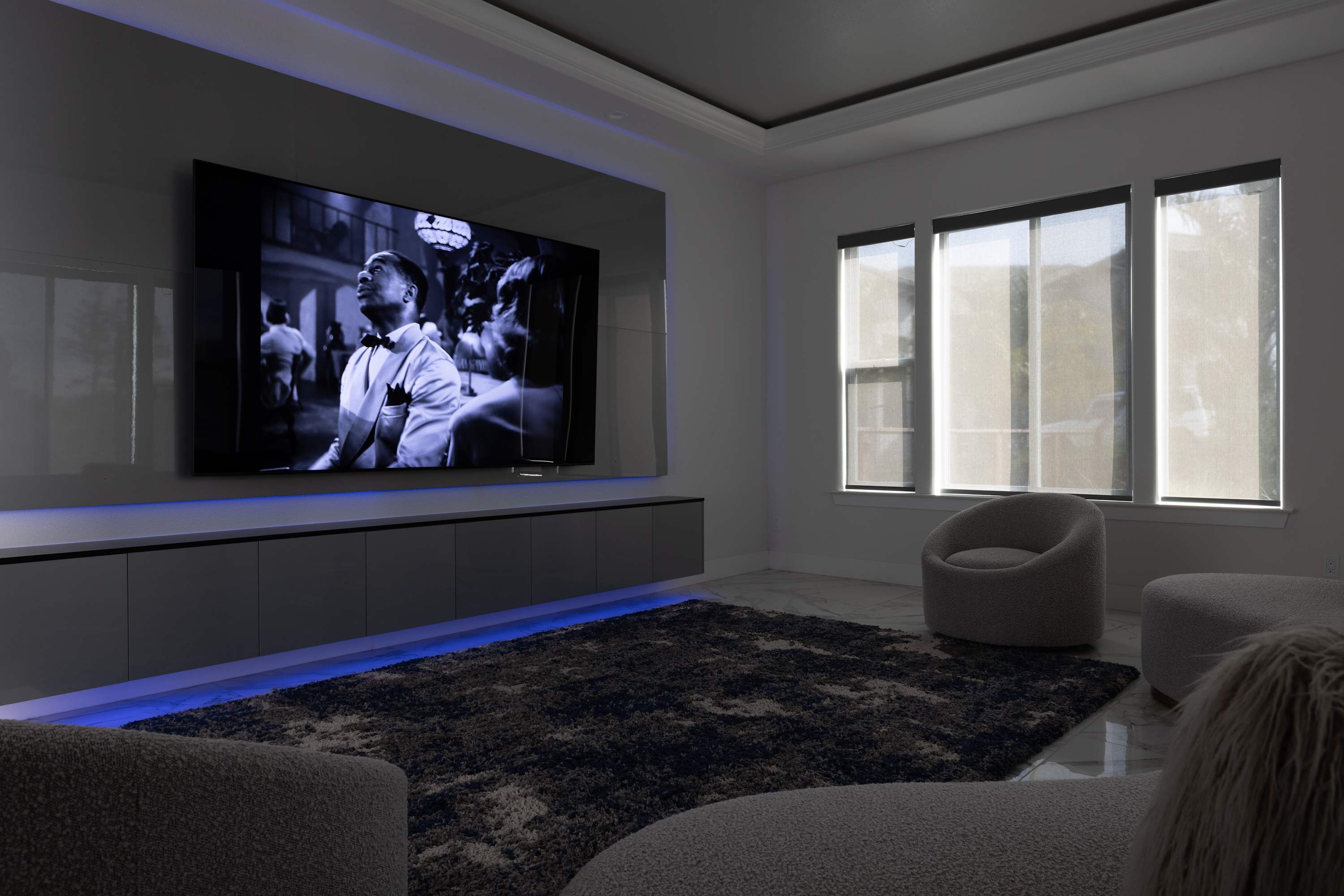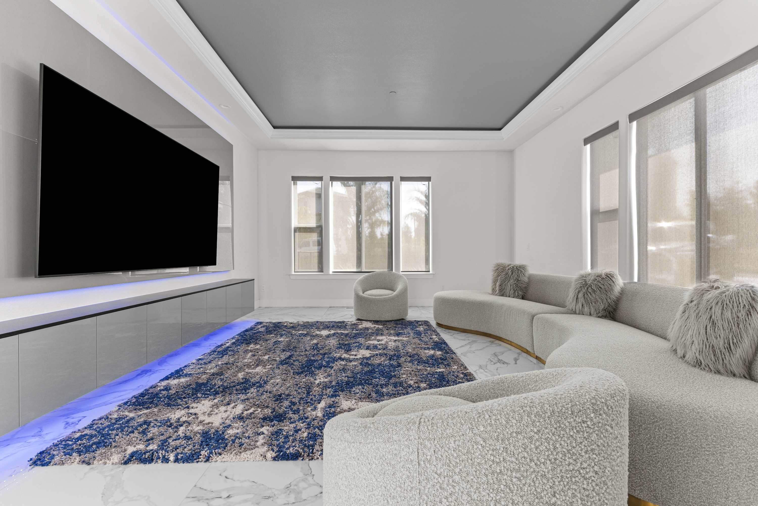 The main level also features an expansive, theater-like media room designed for the ultimate cinematic experience. The space features curated decor, an extra-large sofa, customizable lighting, and room-darkening shades. Nearby, a dedicated office provides an ergonomic workspace and a queen-sized fold-out couch, located conveniently next to a private bathroom and the home's laundry room with a high-efficiency washer and dryer.