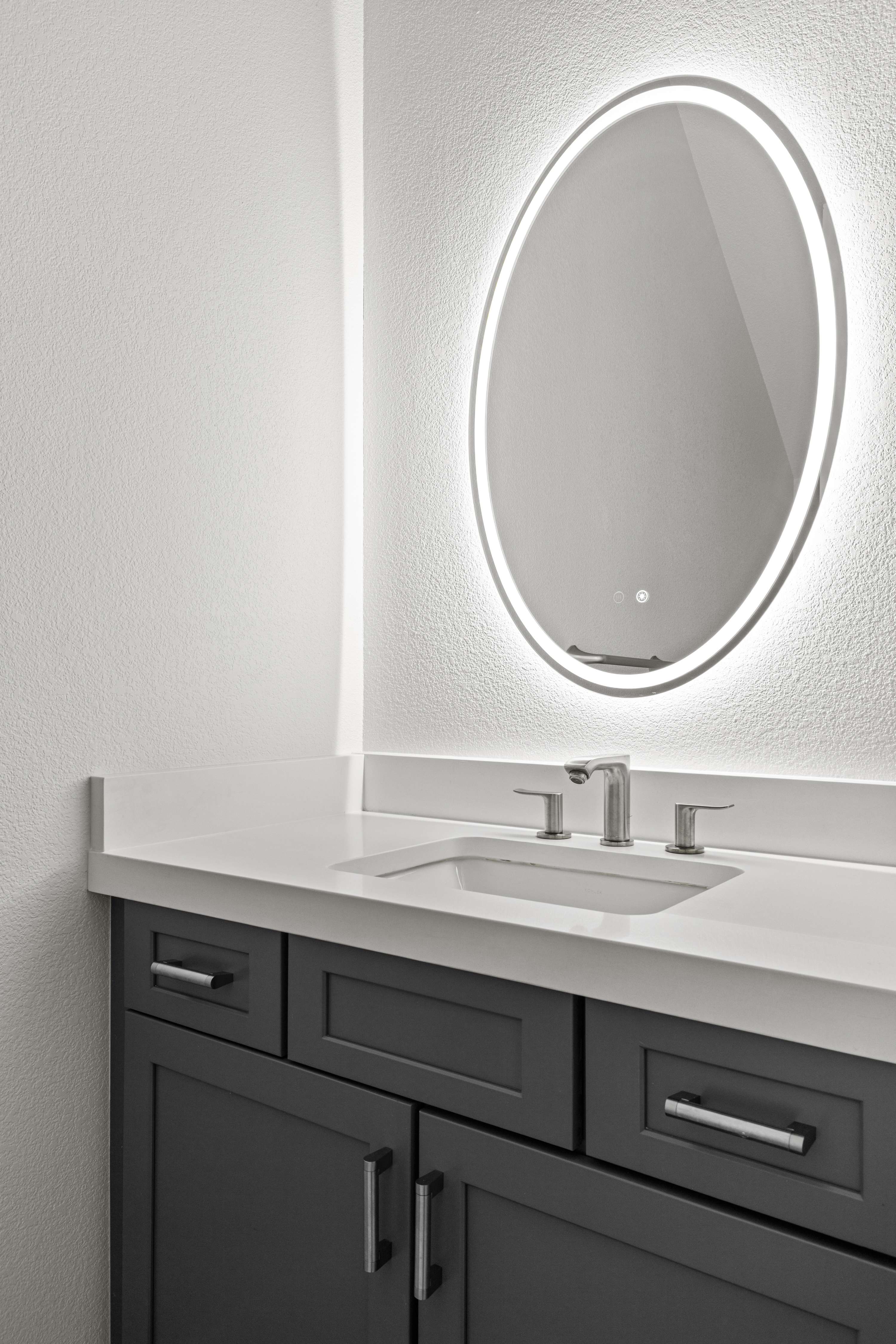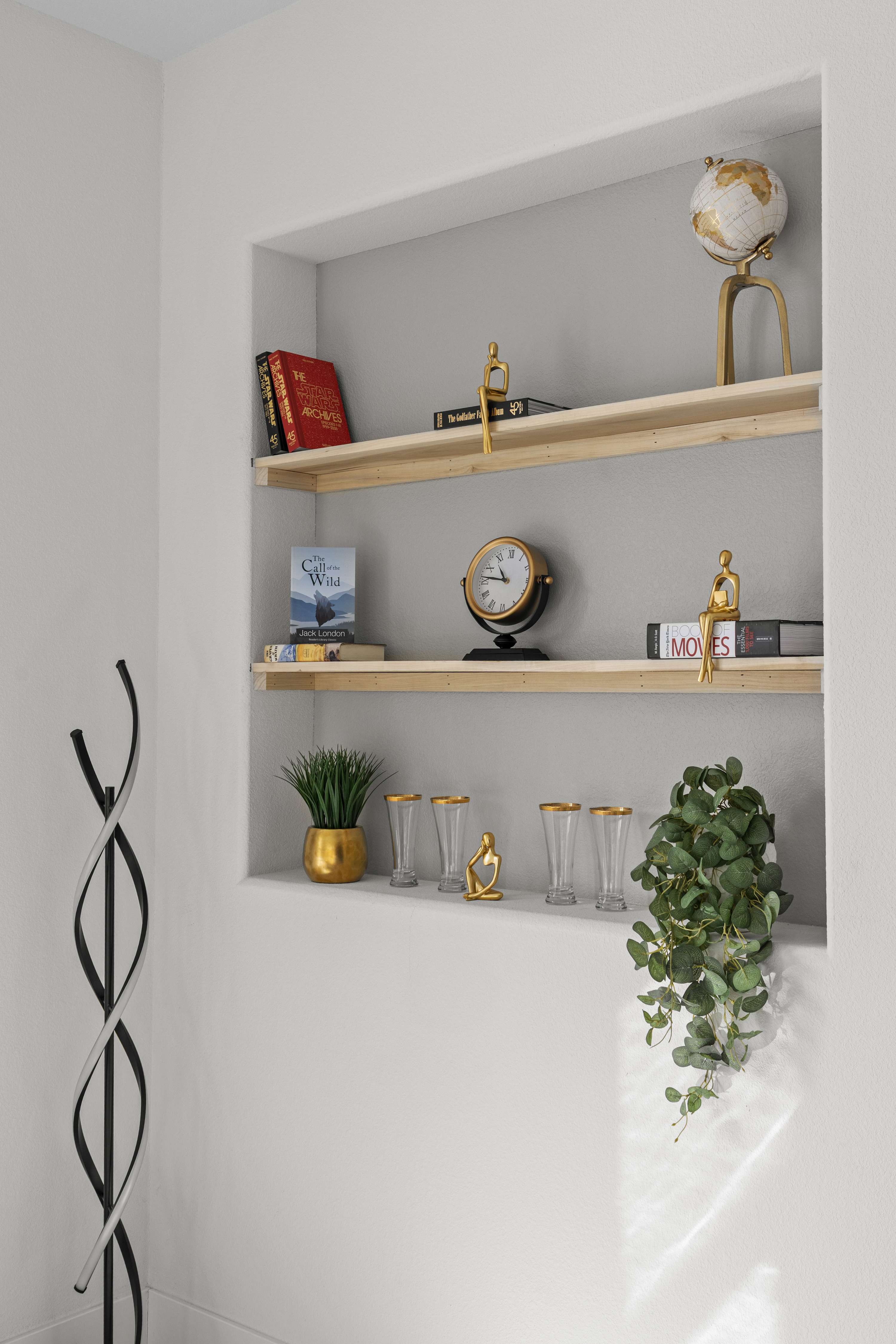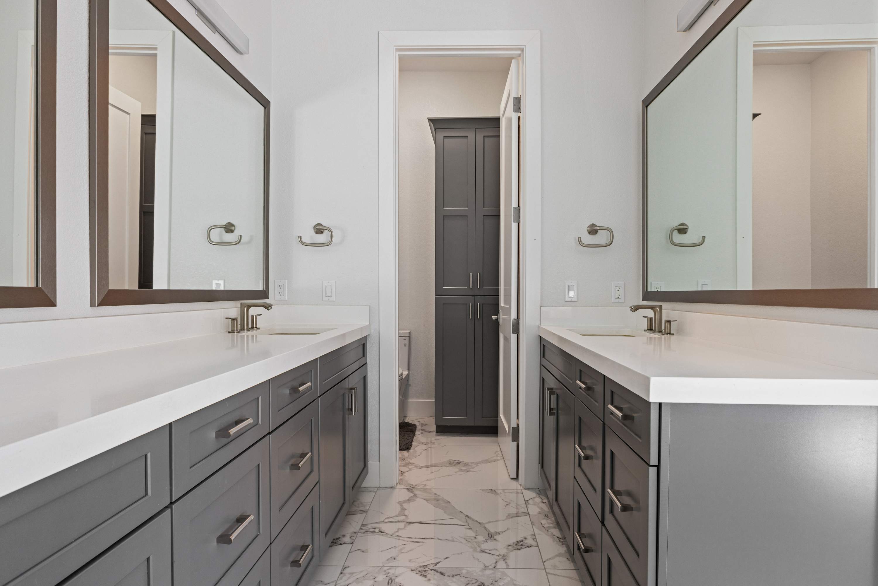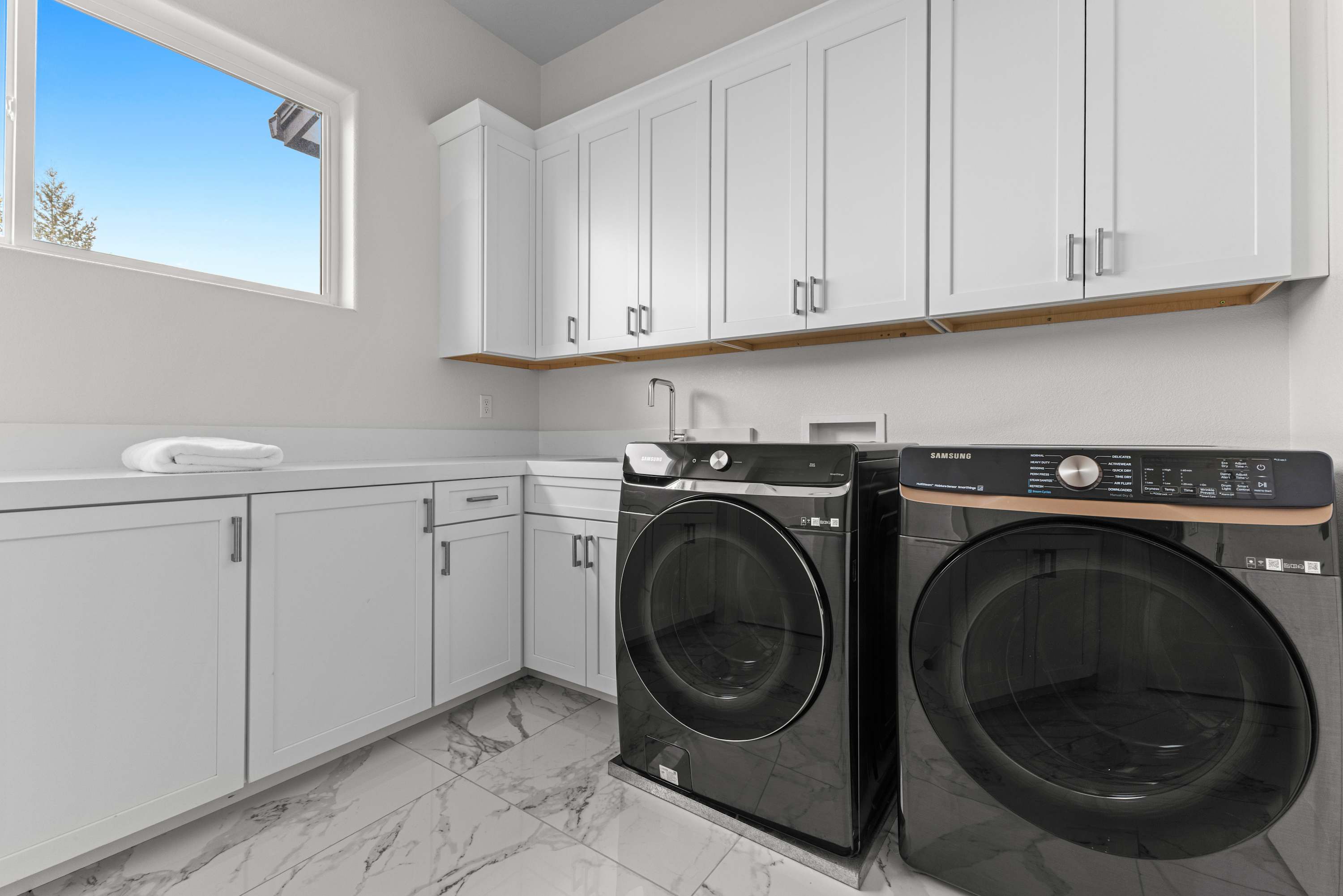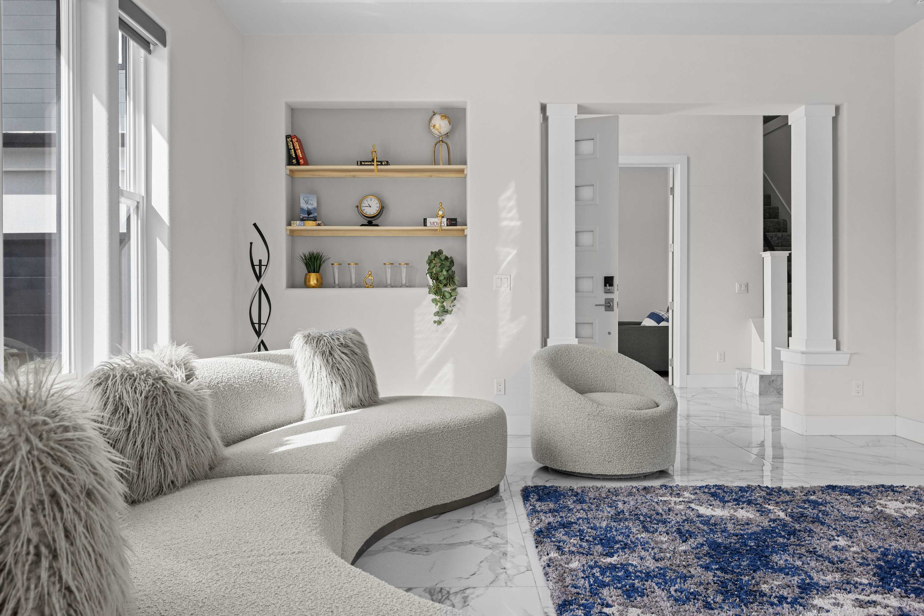 The main level also features an expansive, theater-like media room designed for the ultimate cinematic experience. The space features curated decor, an extra-large sofa, customizable lighting, and room-darkening shades. Nearby, a dedicated office provides an ergonomic workspace and a queen-sized fold-out couch, located conveniently next to a private bathroom and the home's laundry room with a high-efficiency washer and dryer.