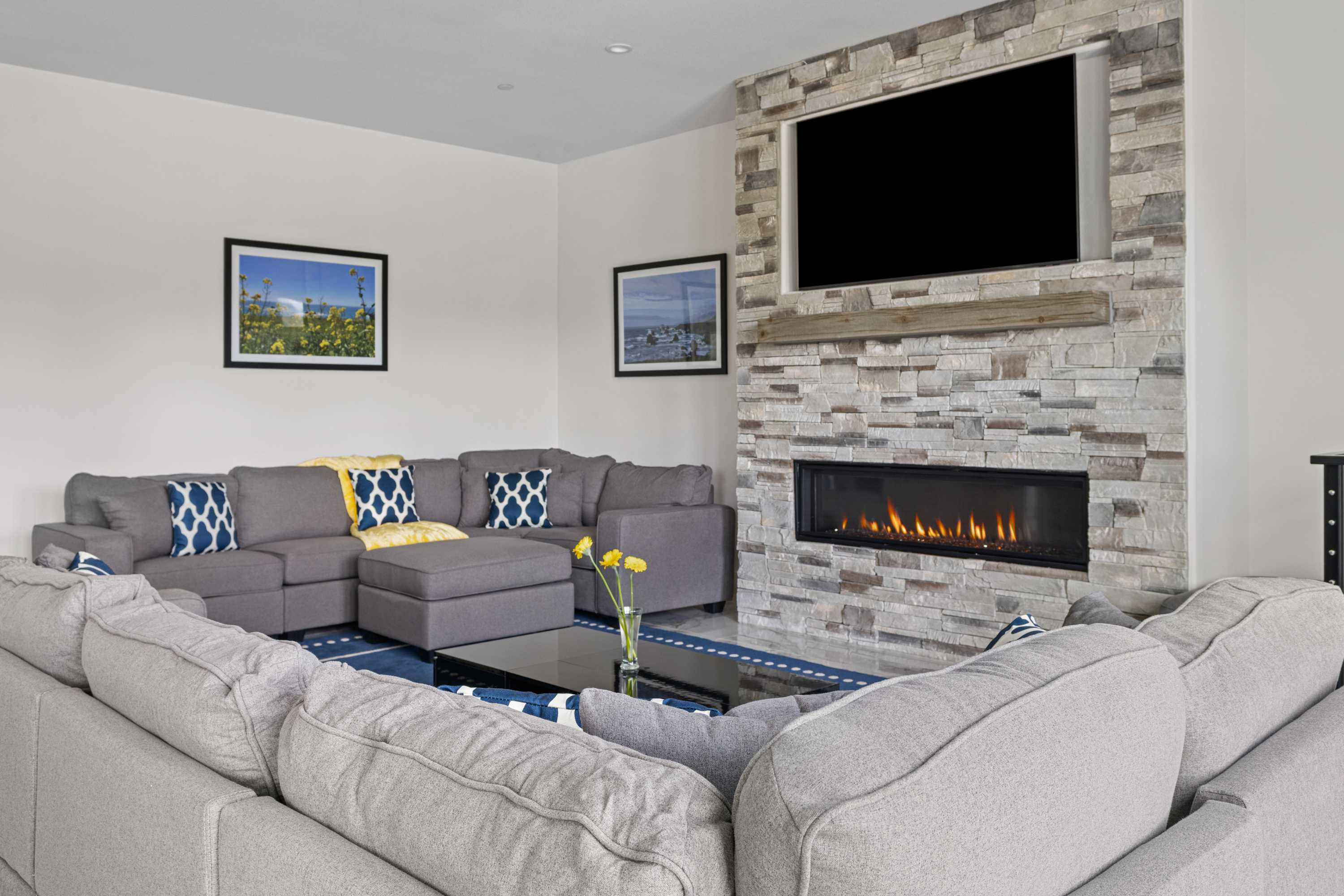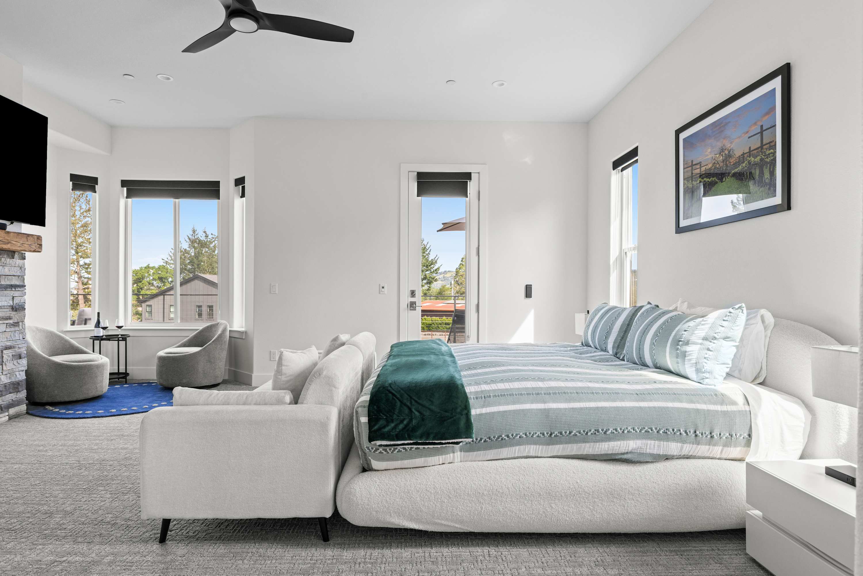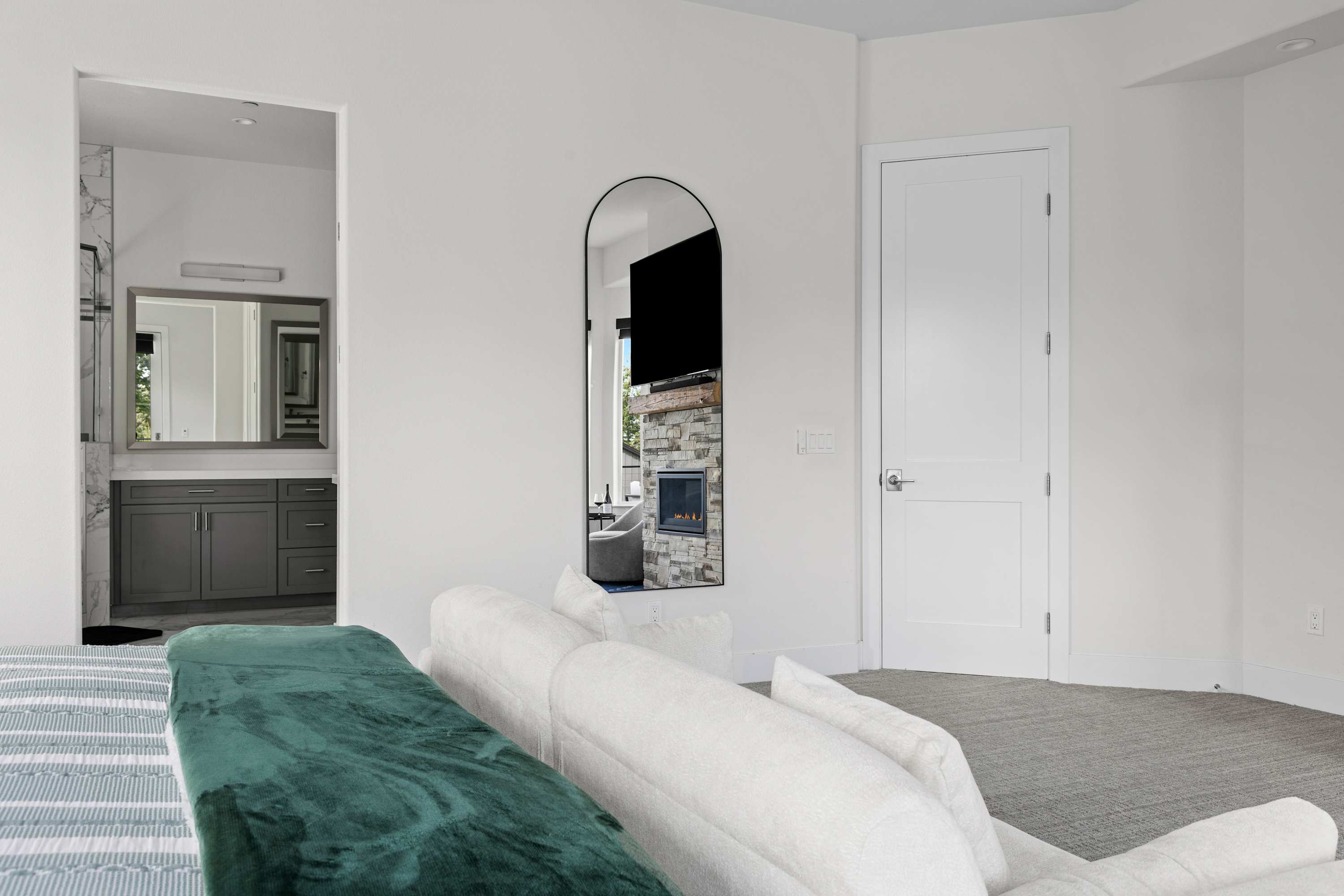 The primary suite is a grand retreat located on the main floor, offering gorgeous views and a private walk-in closet. The suite features a king-sized bed, its own fireplace, and a comfortable lounging couch. The attached ensuite bathroom is designed for total relaxation, featuring a deep soaking tub, an extra-large shower, and double sinks with ample counter space.