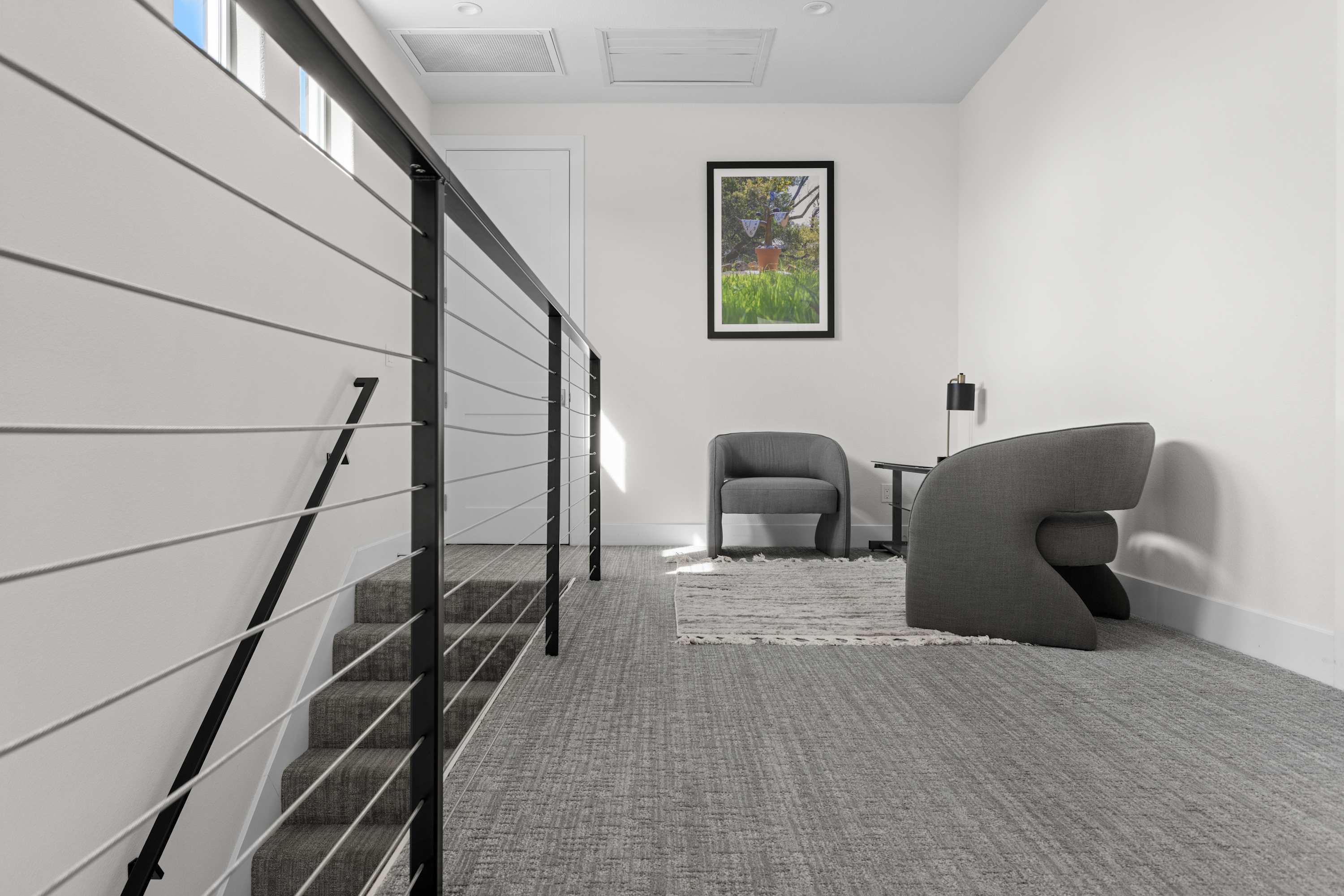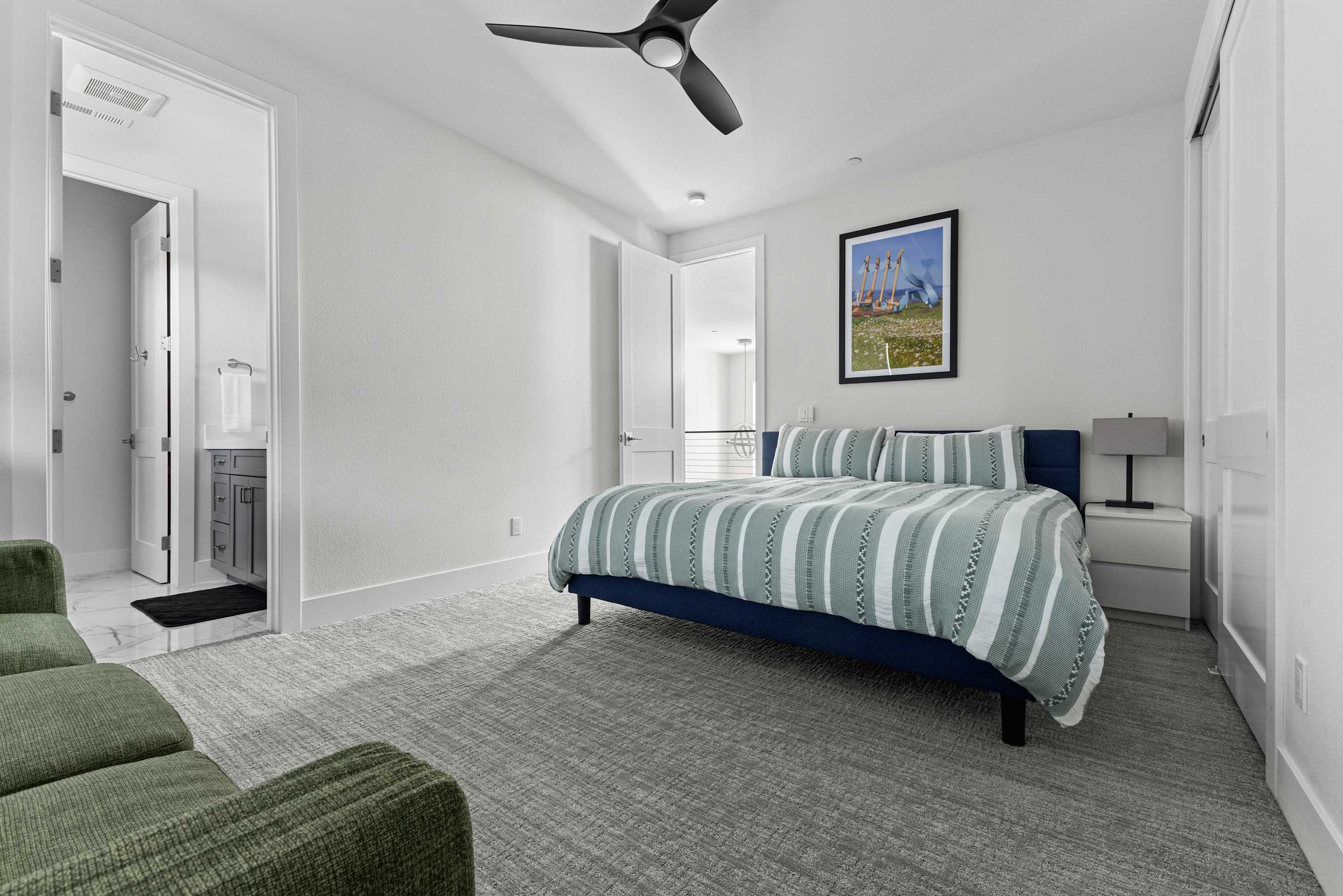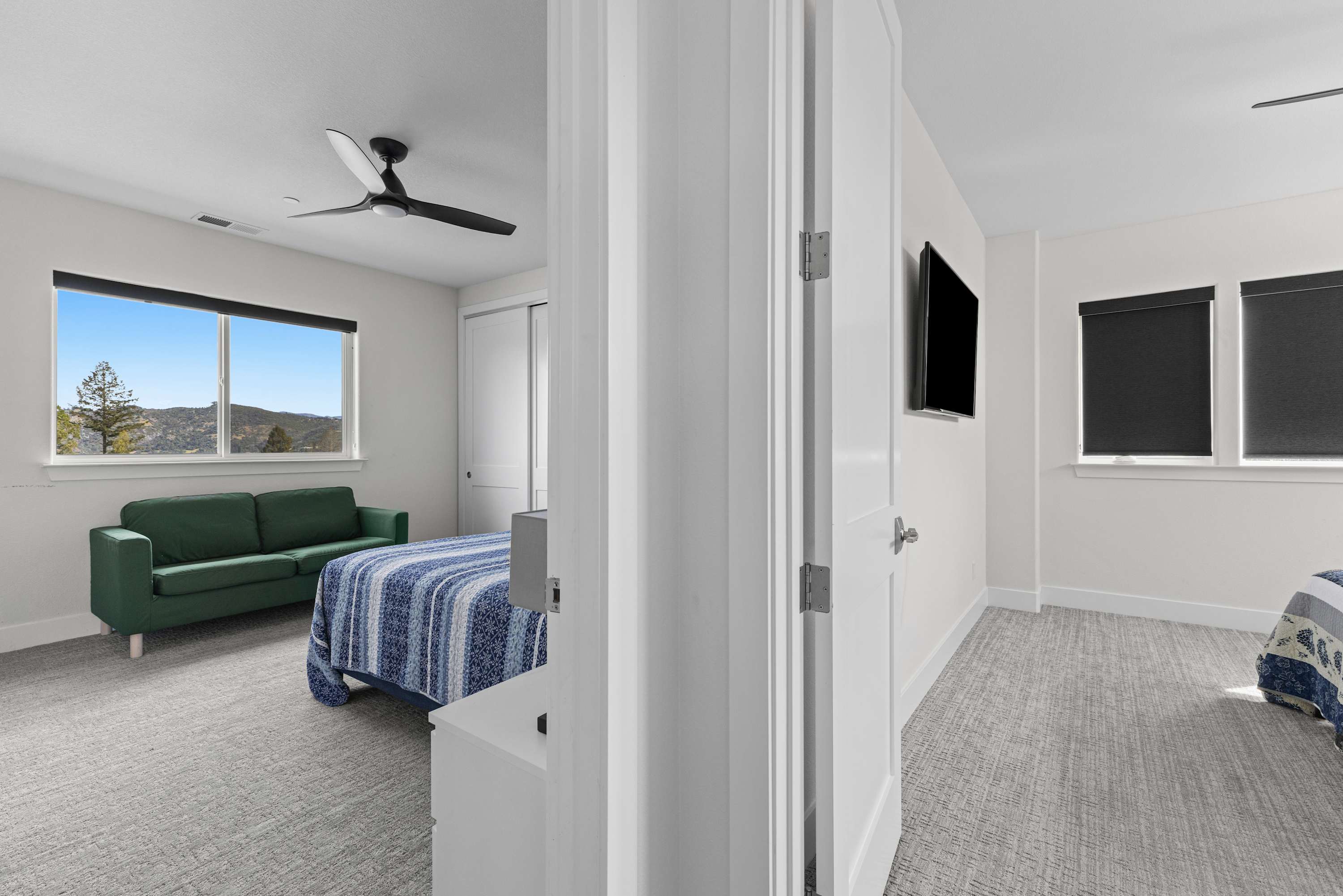 The home's staircase leads to the upper level, where a large landing connects three additional bedrooms and a shared bathroom. The first upstairs bedroom is a private suite with a king bed, an ensuite bathroom, and a lounging couch. The second bedroom offers a queen bed, amazing views of the surrounding hills, and its own lounging couch. The third bedroom features a queen bed and a private TV. These two queen rooms share a well-appointed bathroom located directly off the landing.