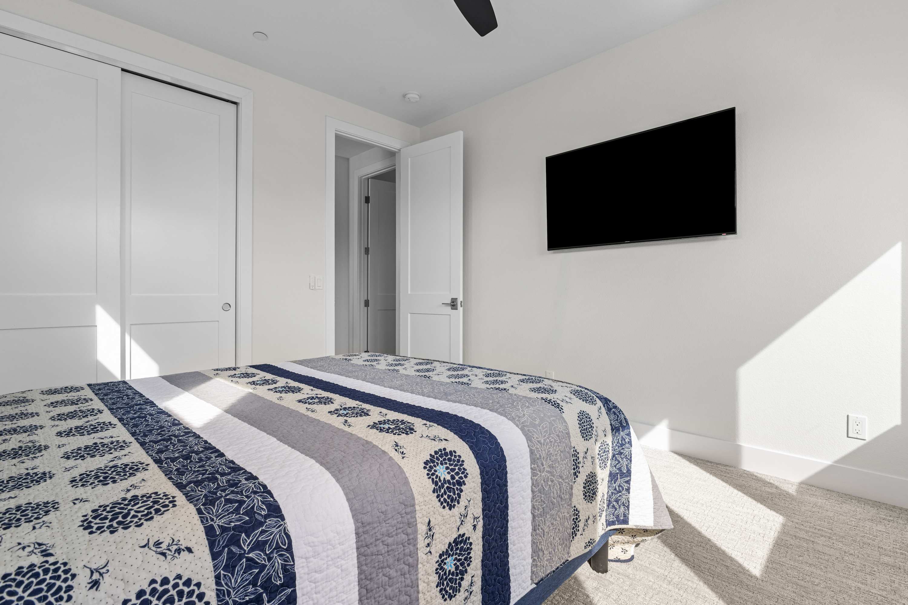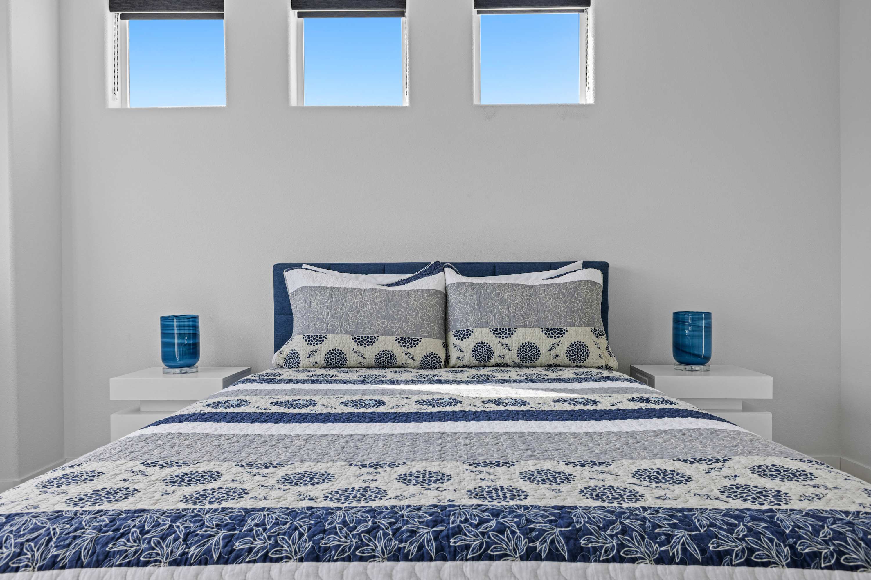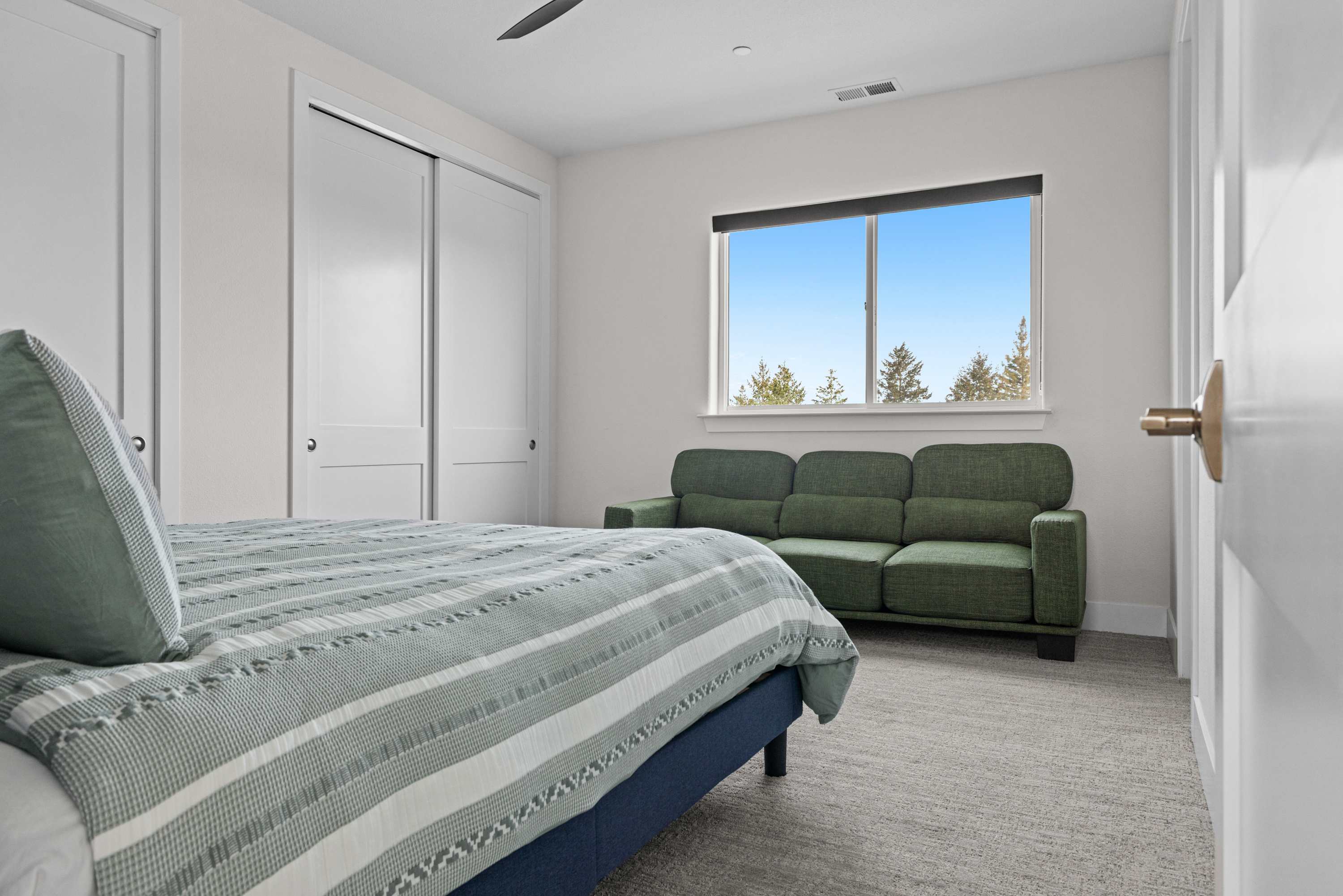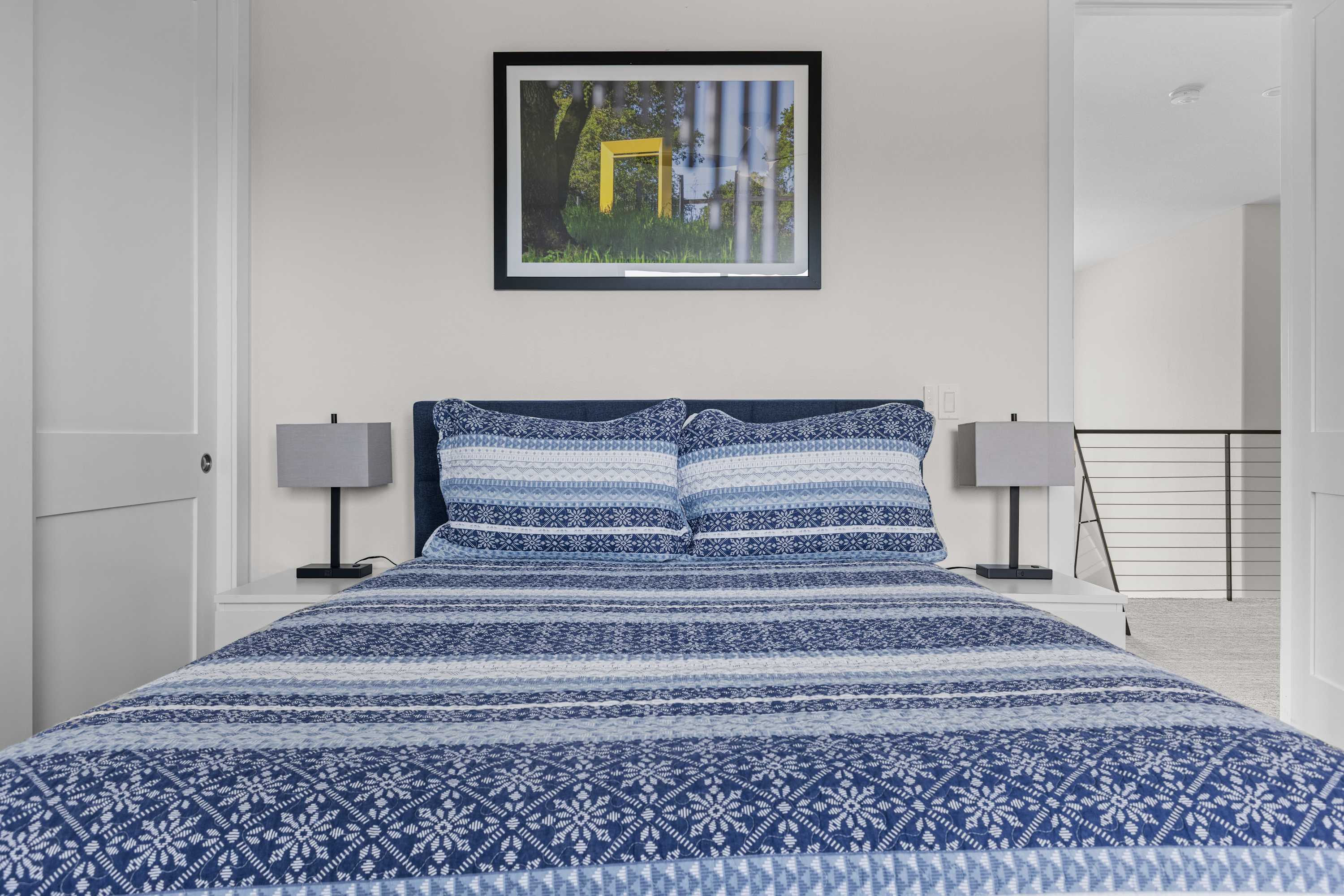 The home's staircase leads to the upper level, where a large landing connects three additional bedrooms and a shared bathroom. The first upstairs bedroom is a private suite with a king bed, an ensuite bathroom, and a lounging couch. The second bedroom offers a queen bed, amazing views of the surrounding hills, and its own lounging couch. The third bedroom features a queen bed and a private TV. These two queen rooms share a well-appointed bathroom located directly off the landing.