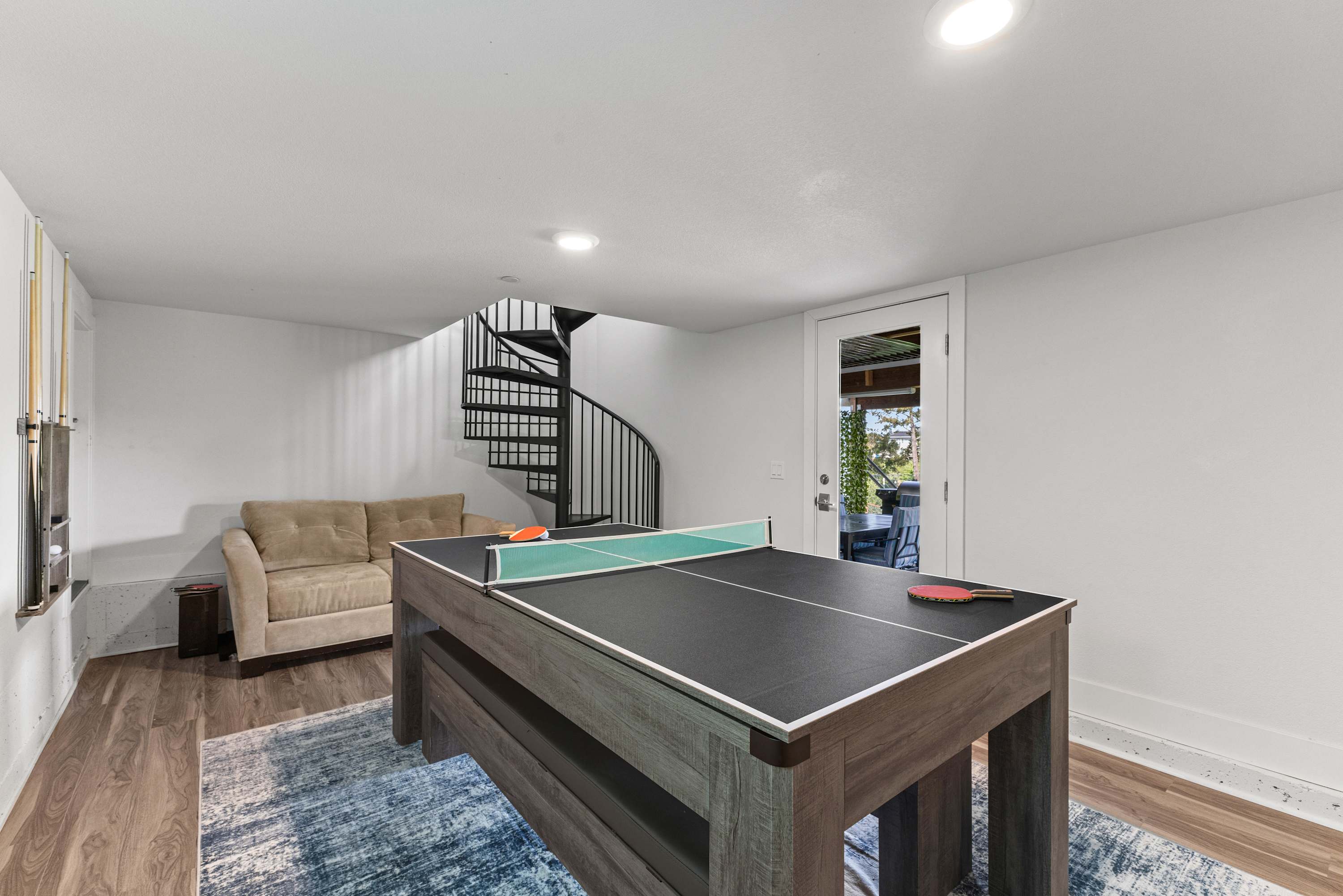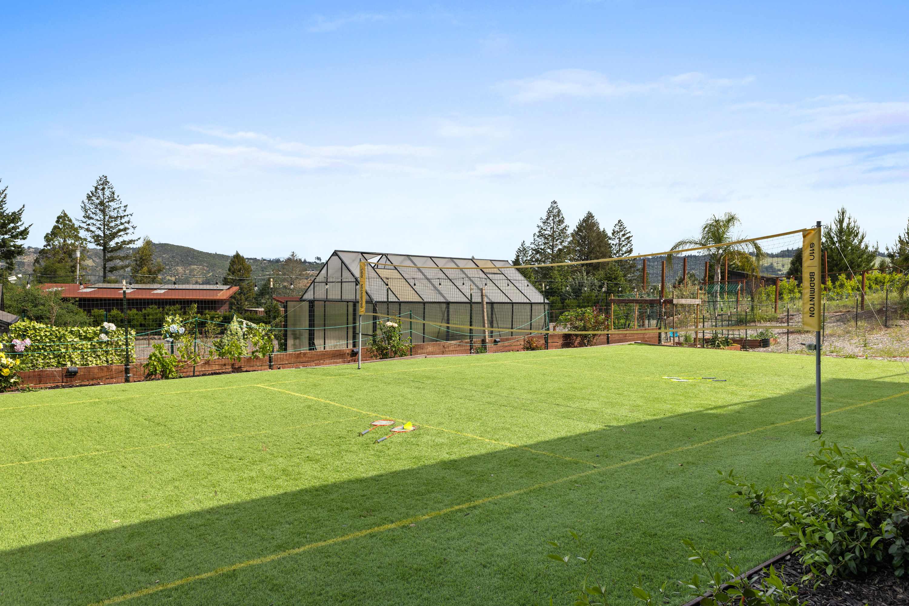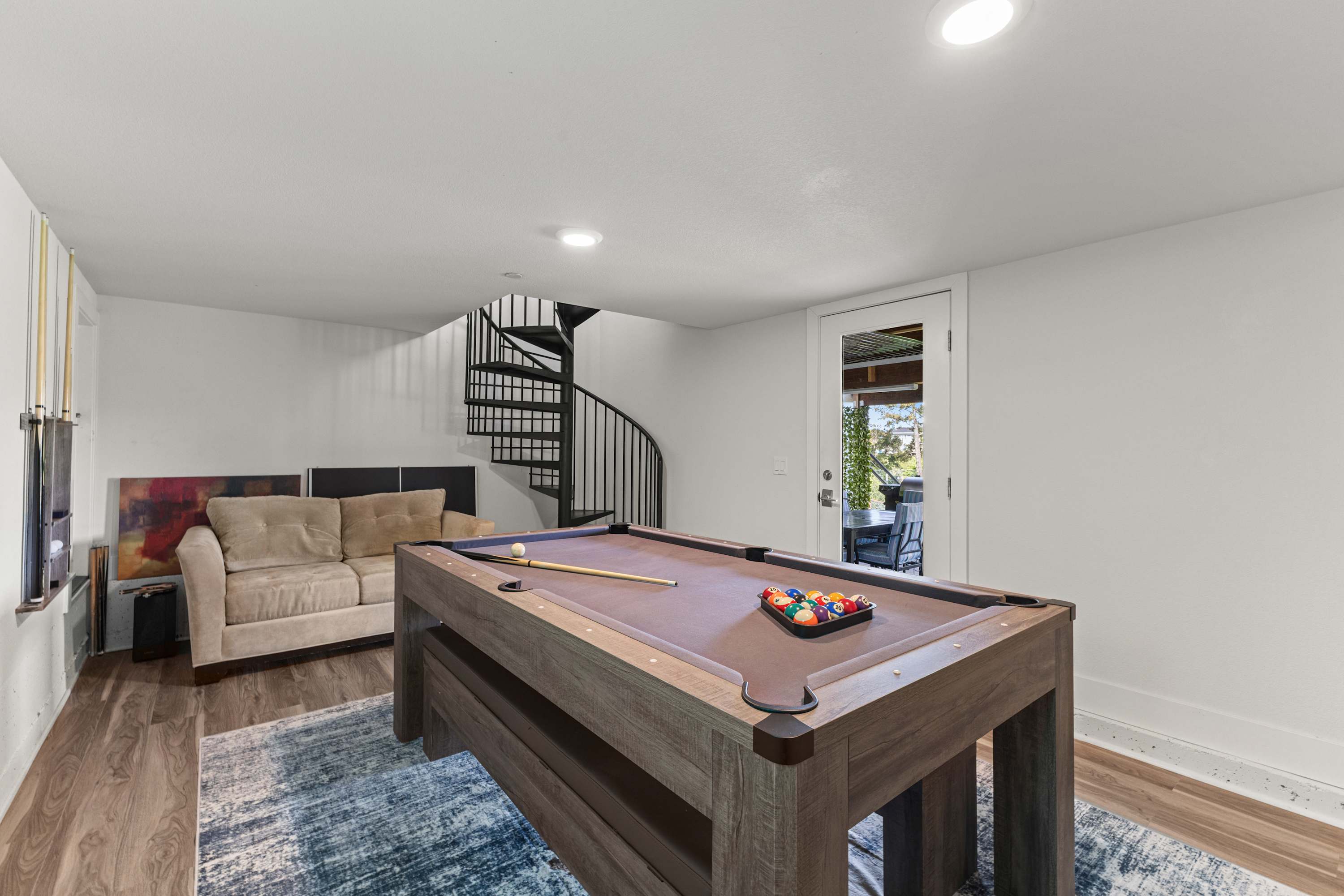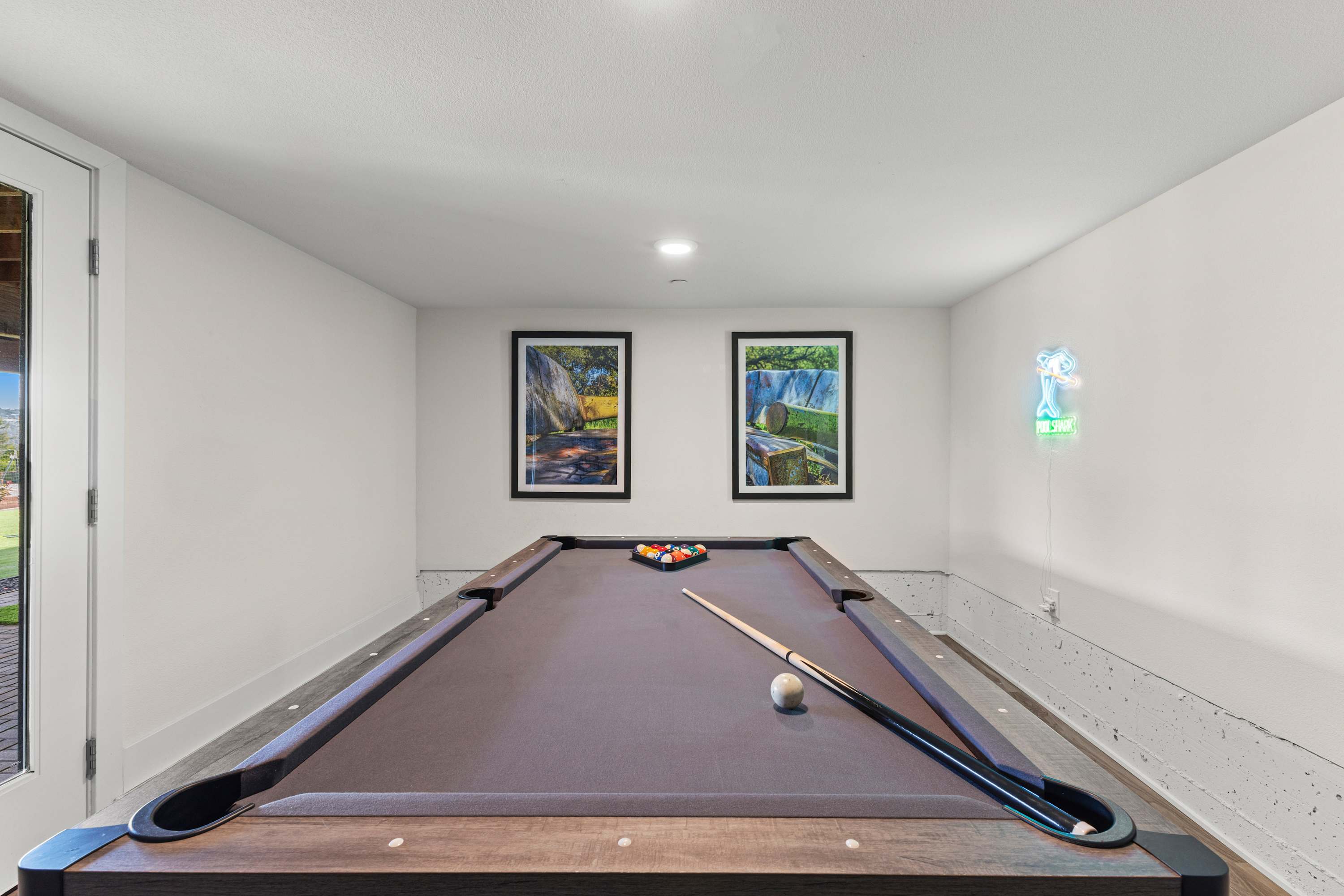 From the living room, a spiral staircase leads down to the versatile game room, which features its own collection of original Sonoma County photography, a neon pool sign, and a table that converts from pool to ping pong. Just outside the game room, the experience continues into the yard, which features a full badminton court complete with a net and rackets. For those seeking shade, the lower patio tucked under the deck offers a BBQ and outdoor seating, all bordered by gardens that frame the court.