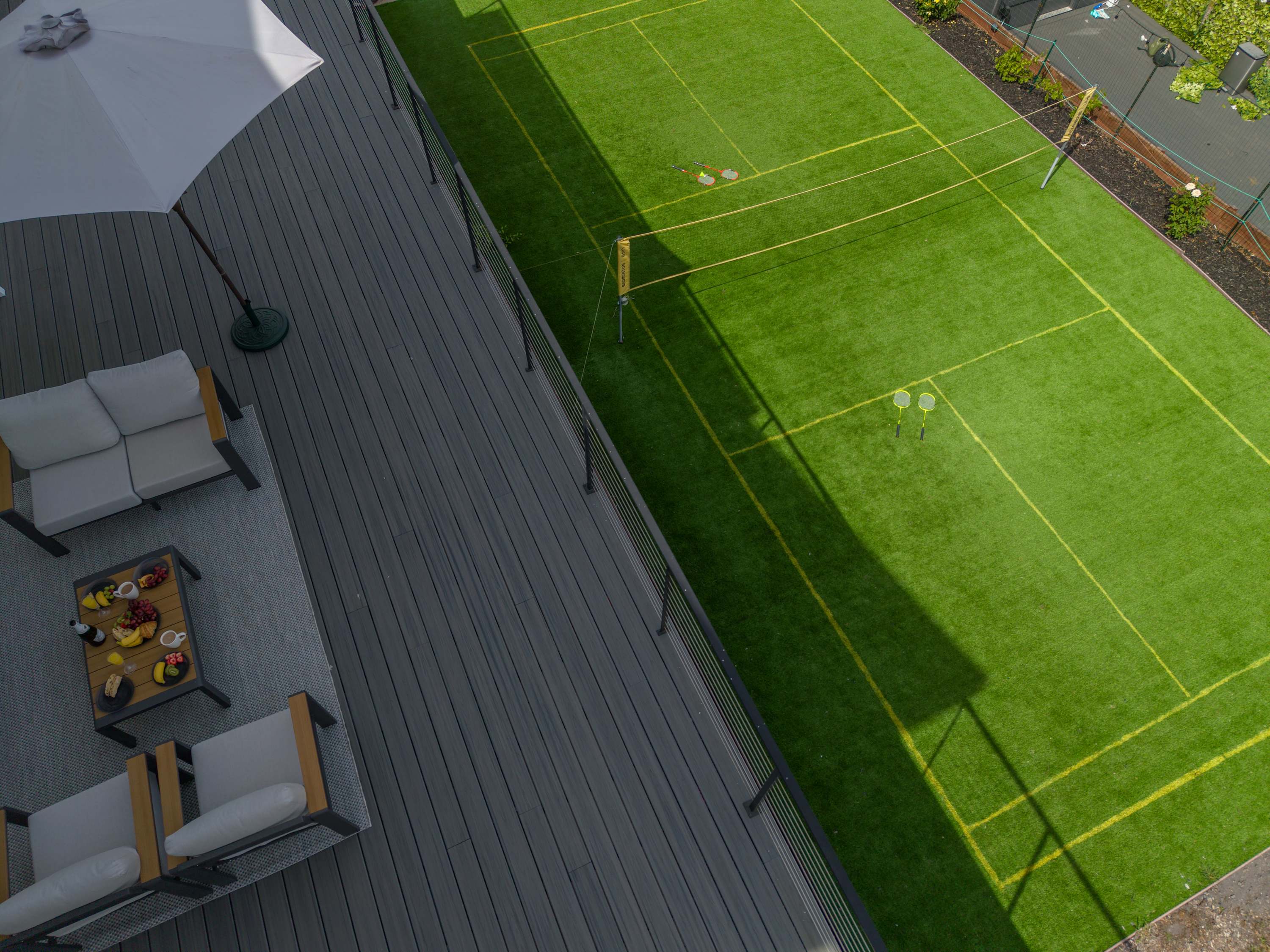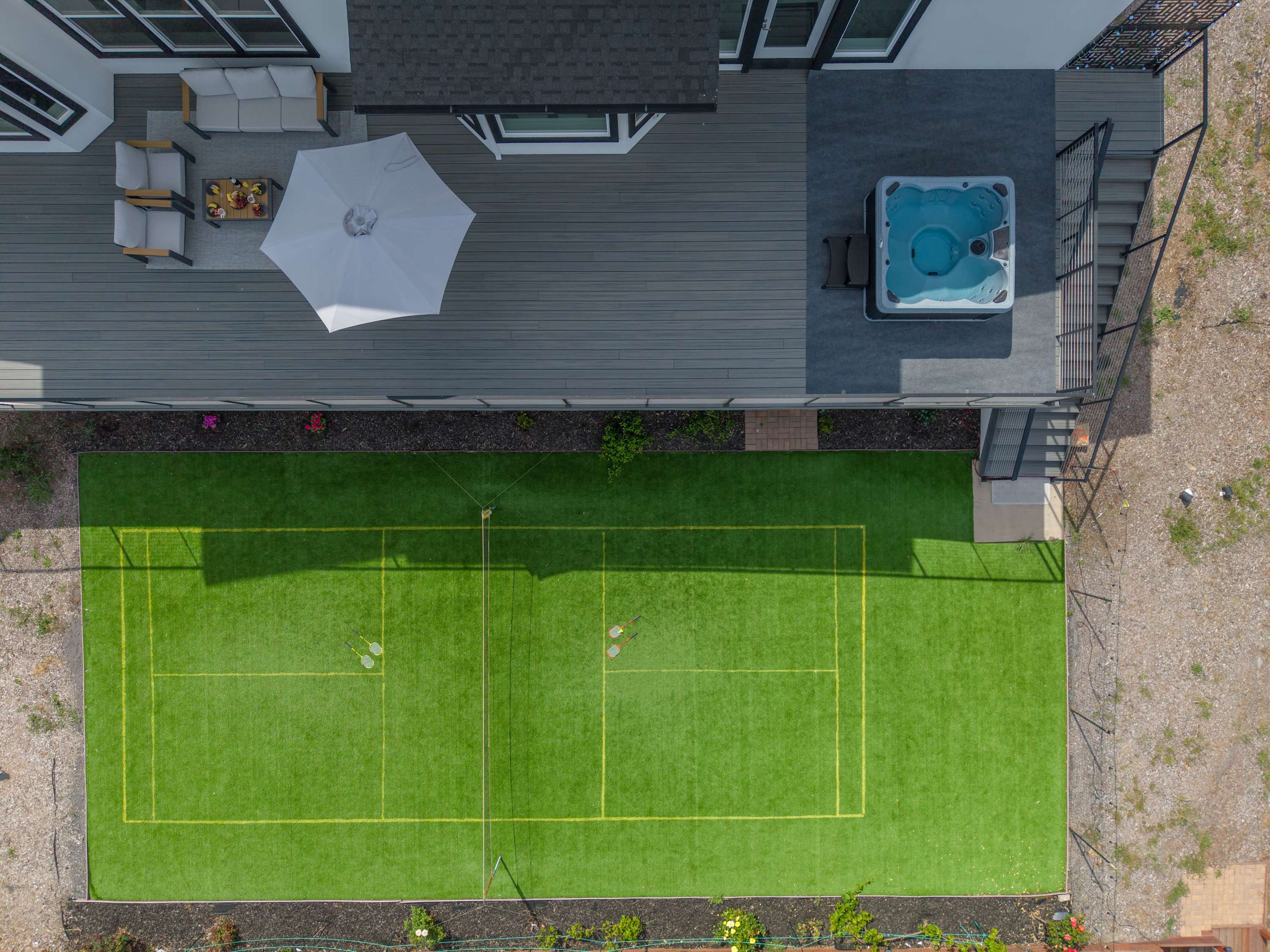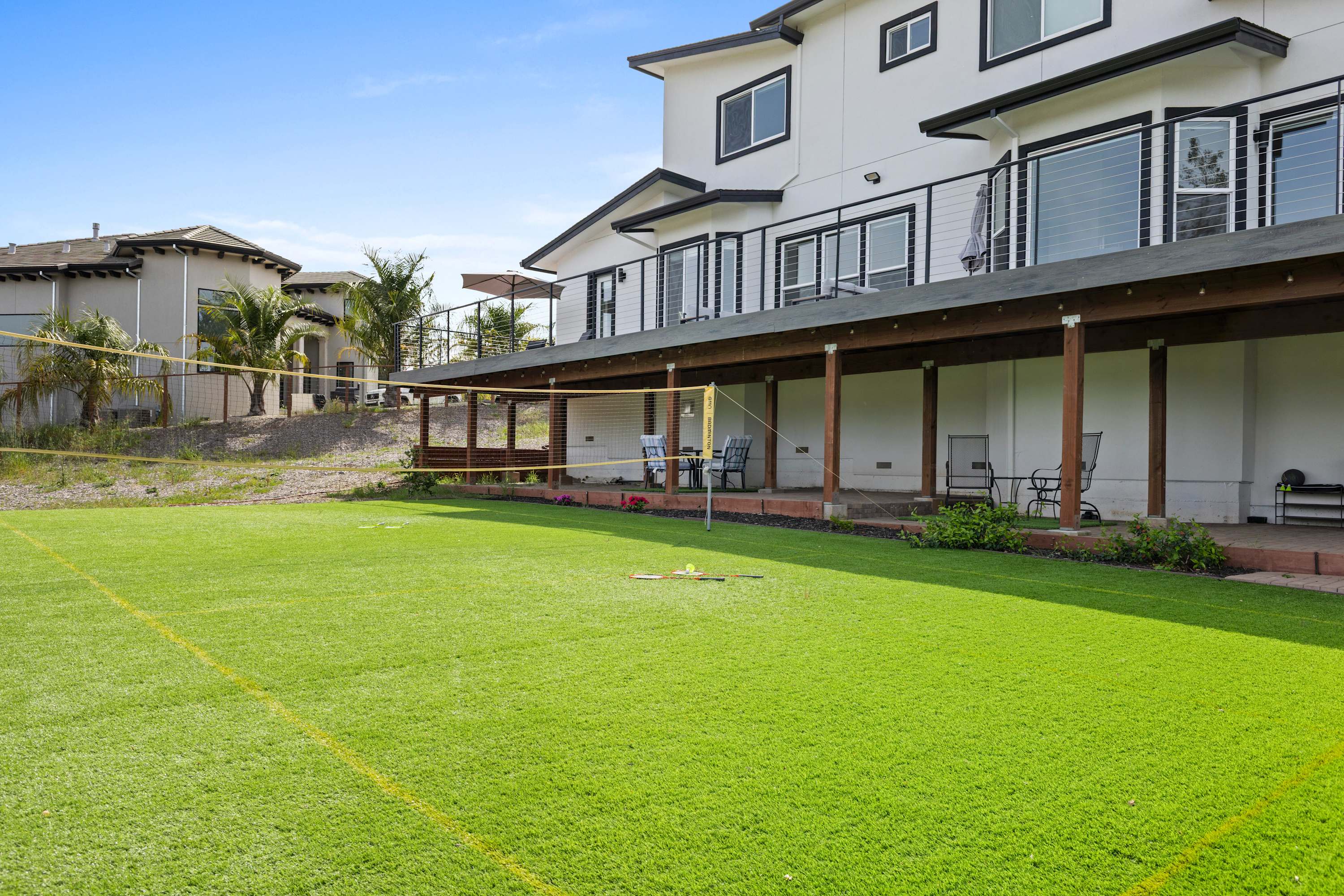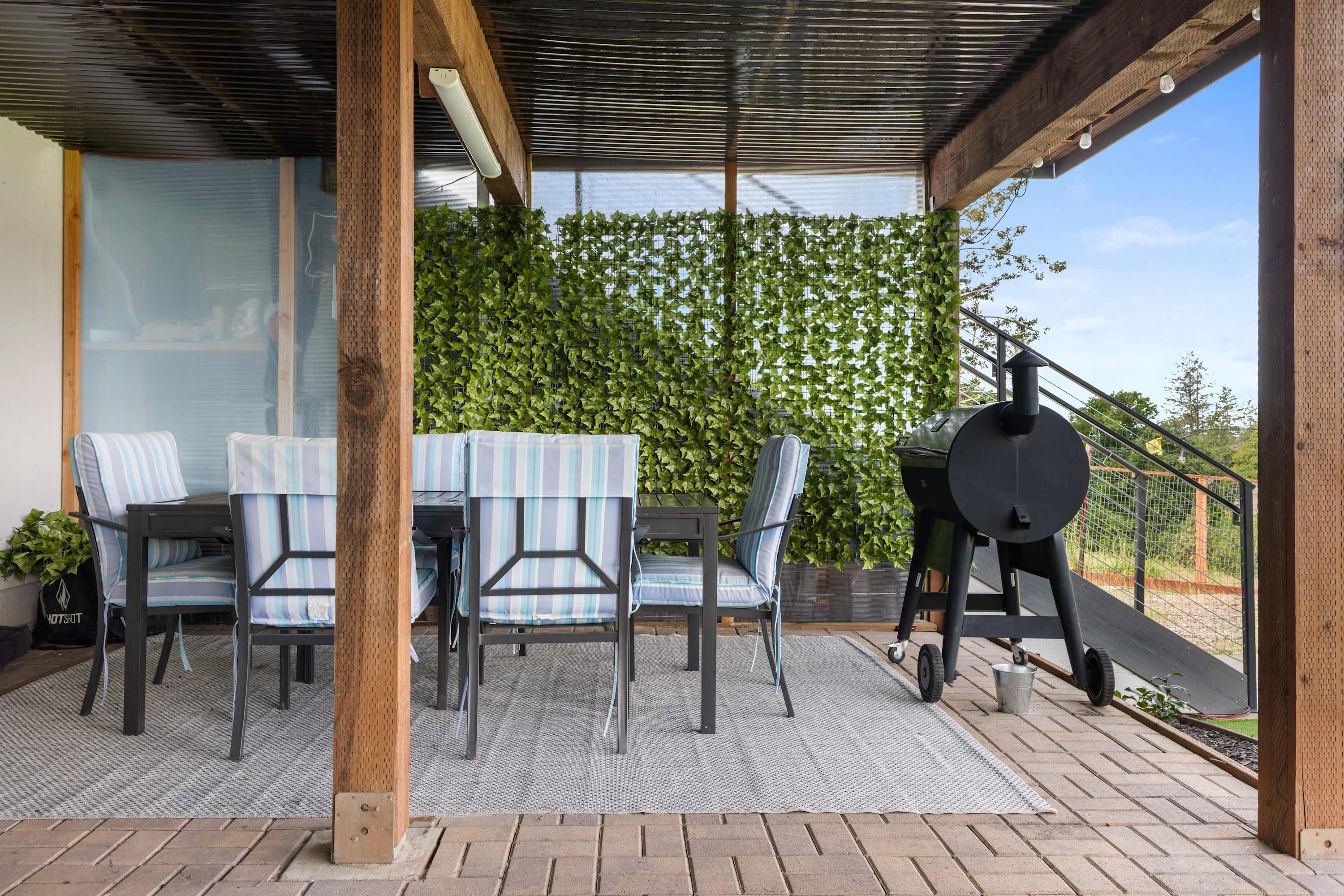 From the living room, a spiral staircase leads down to the versatile game room, which features its own collection of original Sonoma County photography, a neon pool sign, and a table that converts from pool to ping pong. Just outside the game room, the experience continues into the yard, which features a full badminton court complete with a net and rackets. For those seeking shade, the lower patio tucked under the deck offers a BBQ and outdoor seating, all bordered by gardens that frame the court.