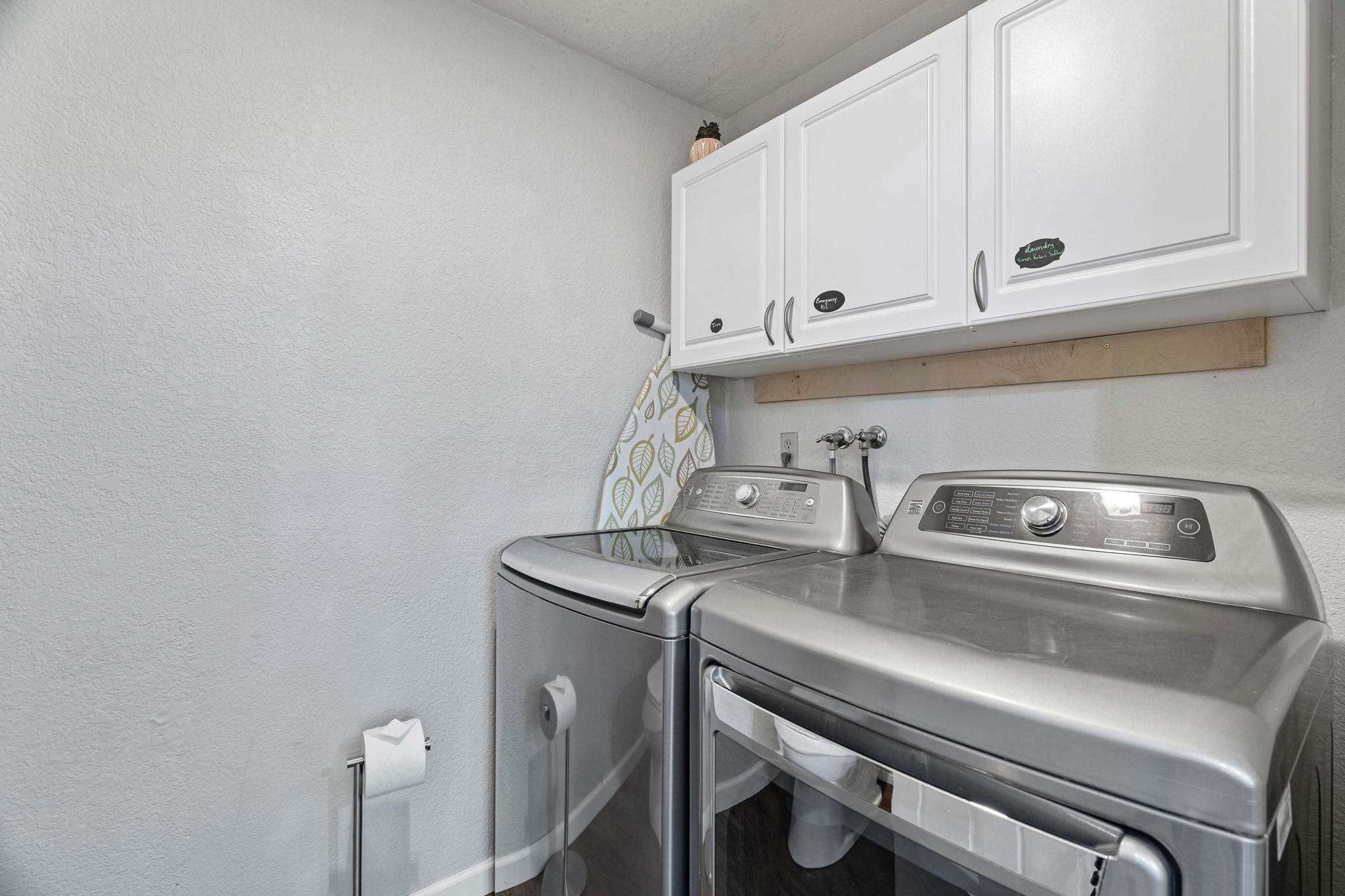 The fully equipped kitchen, adjacent to the living room, has everything you need to prepare delicious meals or bake your favorite dessert. A list of additional items, like a Vitamix, KitchenAid, and numerous other kitchen gadgets, are available upon request. A half bathroom off the kitchen doubles as a laundry room, complete with a washer and dryer.