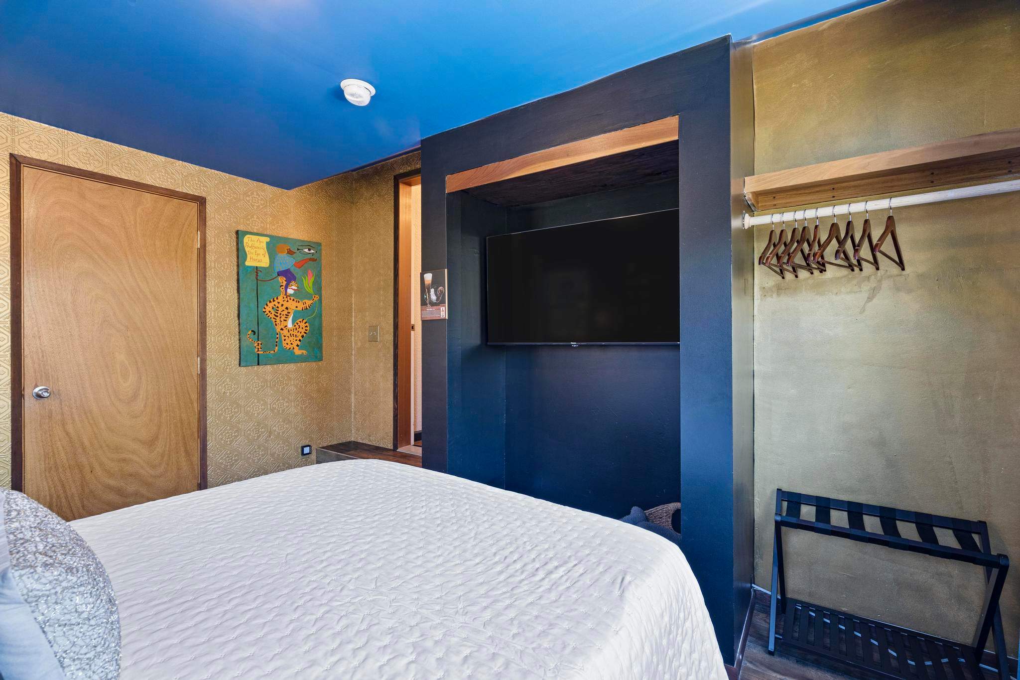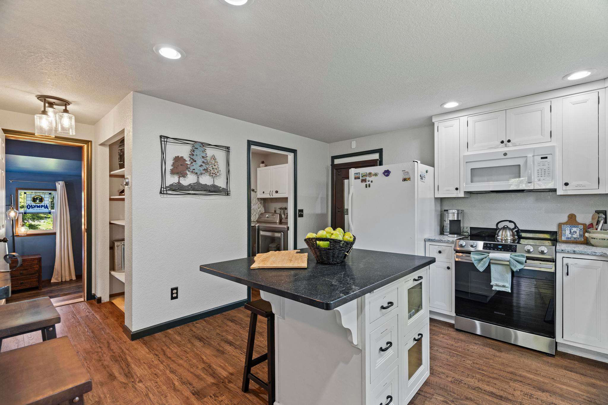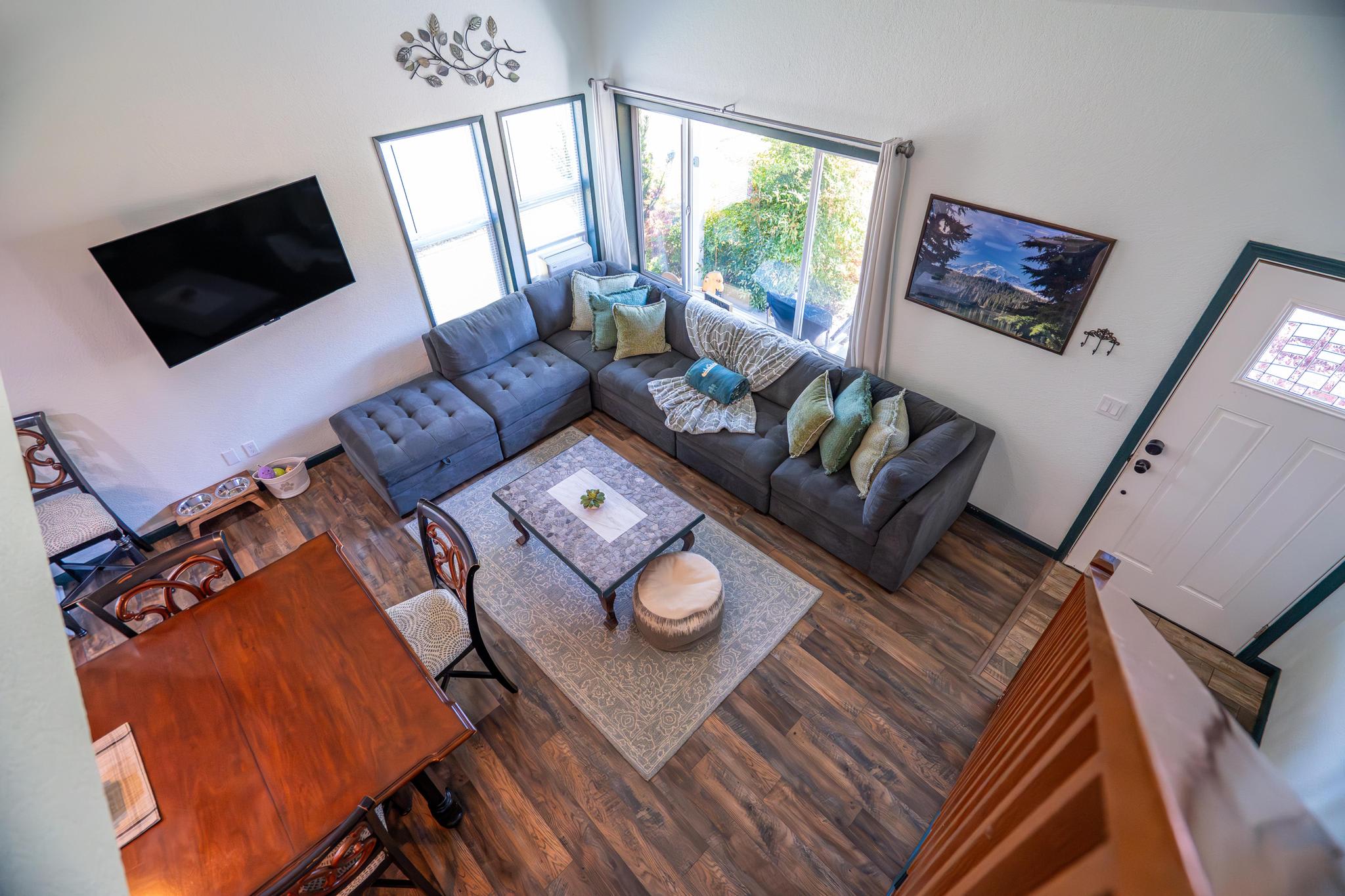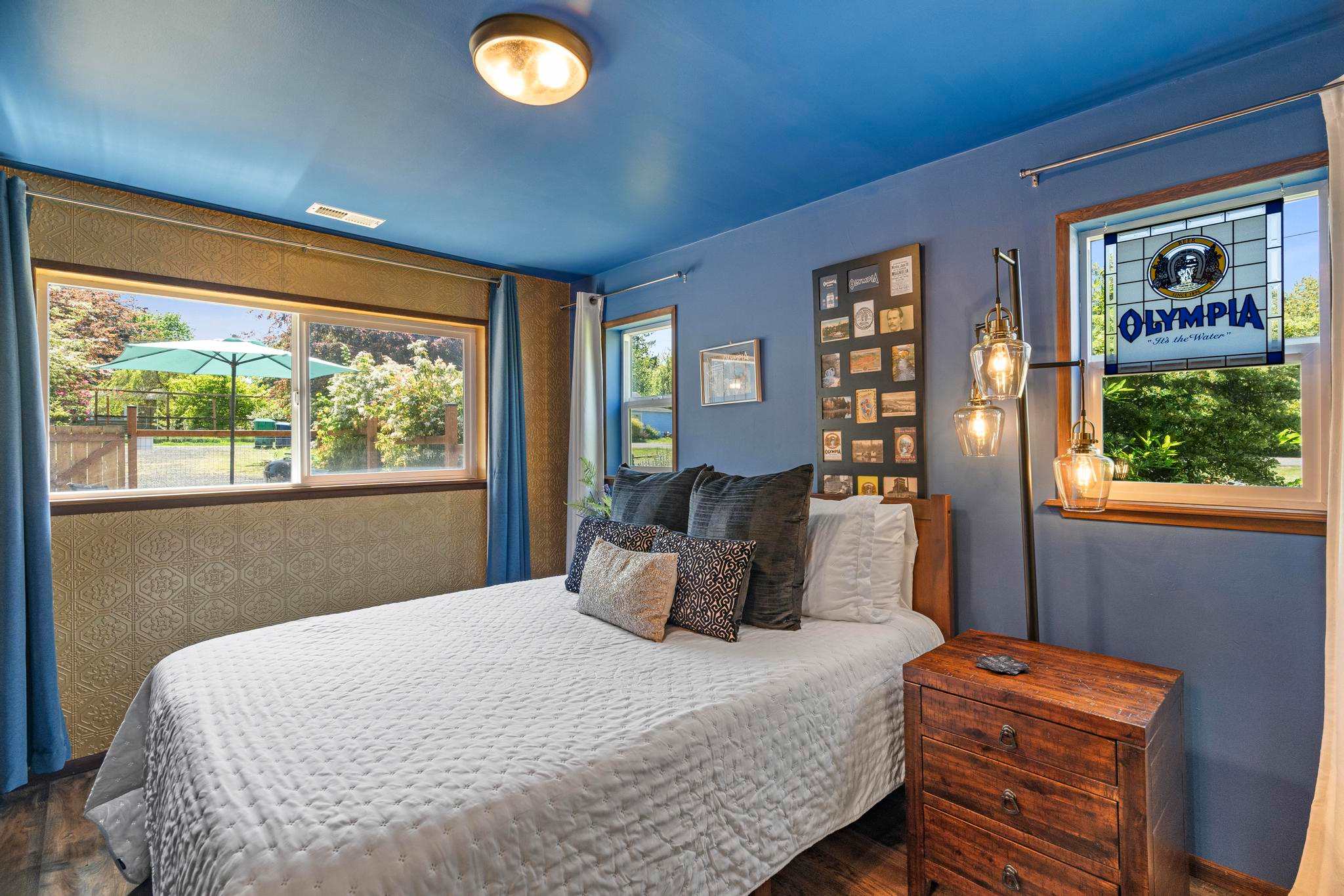 Off the kitchen, you'll find the cozy downstairs bedroom, themed after the historic Olympia Beer Company, and aptly named the Olympia room. This inviting space features a queen size, memory foam mattress and a 42" Roku Smart TV, providing a space separate from the other bedroom, perfect for night owls or early risers.