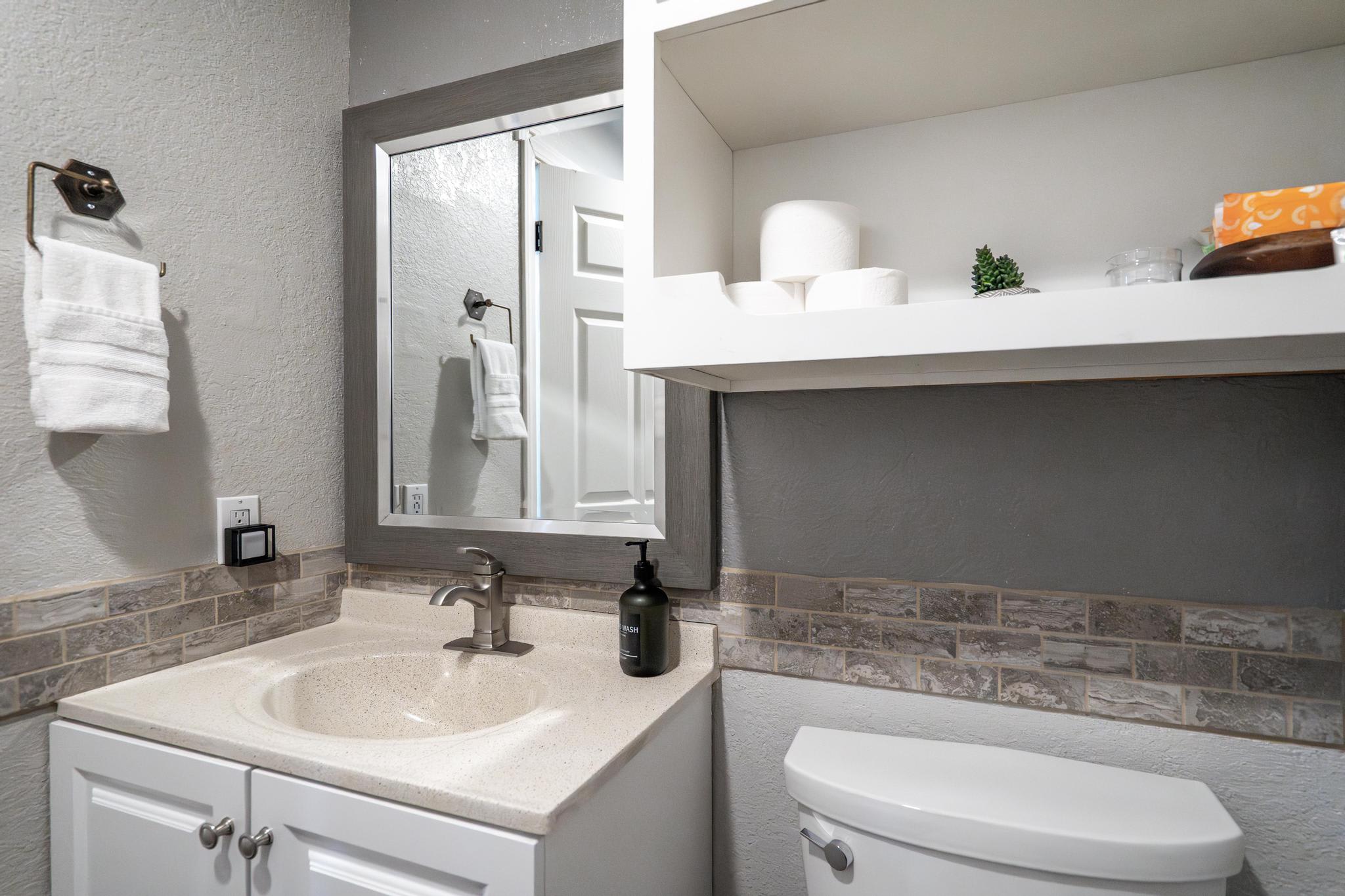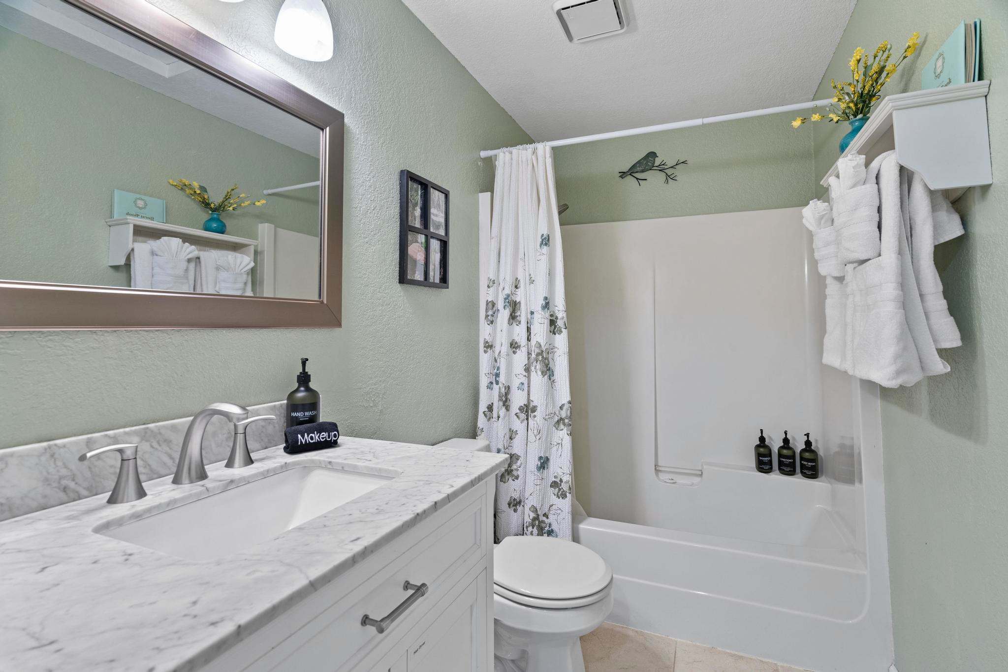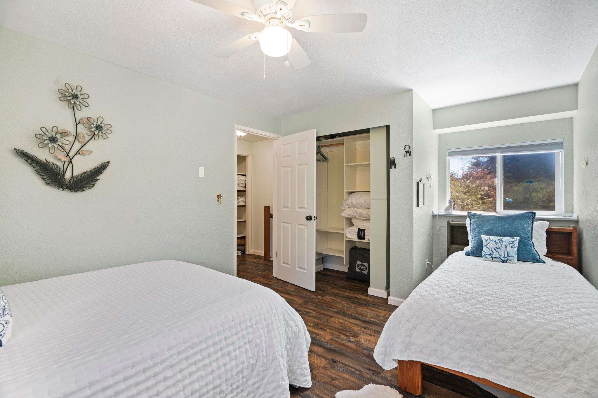 Both bedrooms come with ample closet space, allowing guests to unpack and feel at home during their stay. A full bathroom with a shower and bathtub is located upstairs, adjacent to the bedrooms.