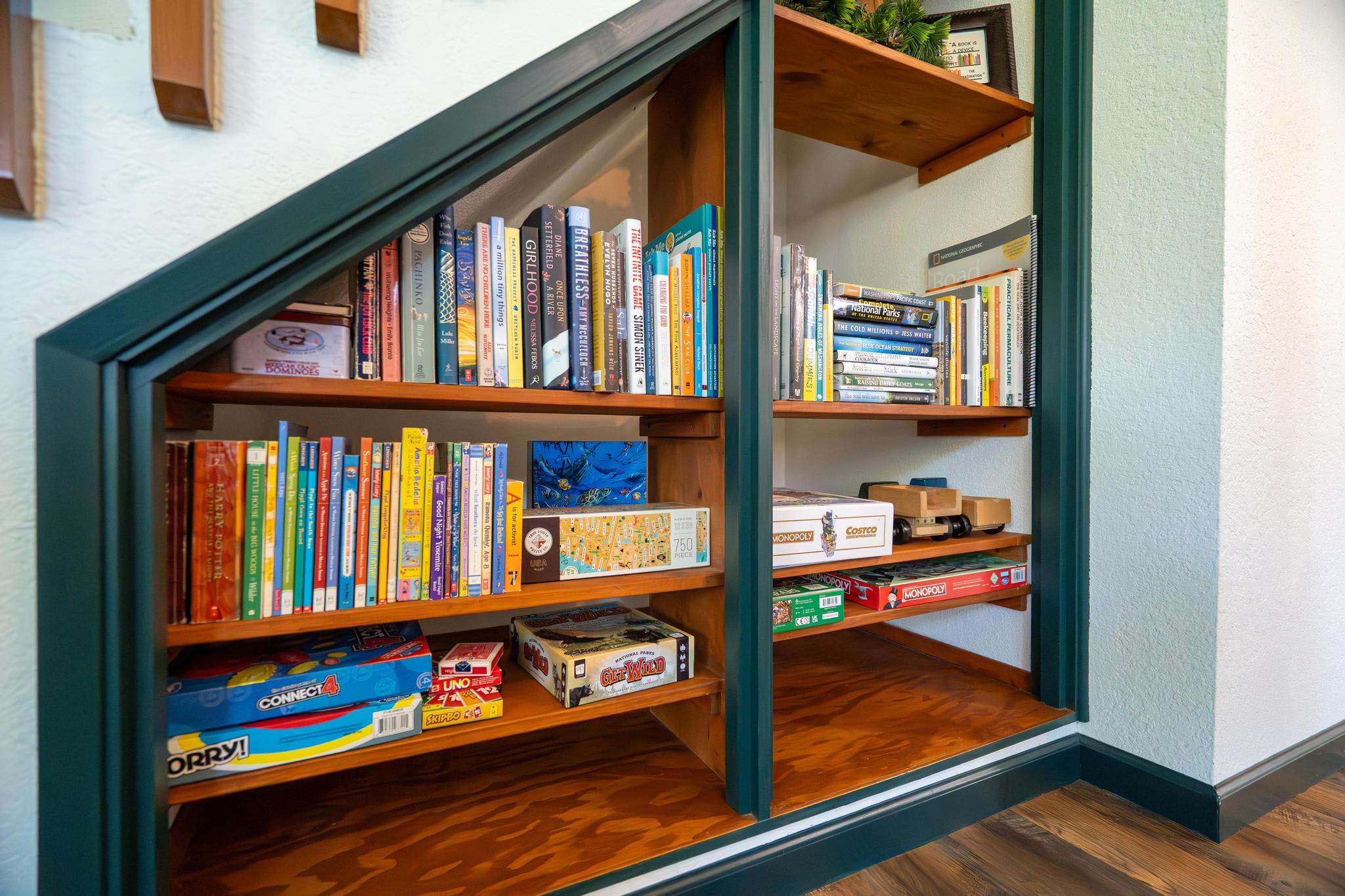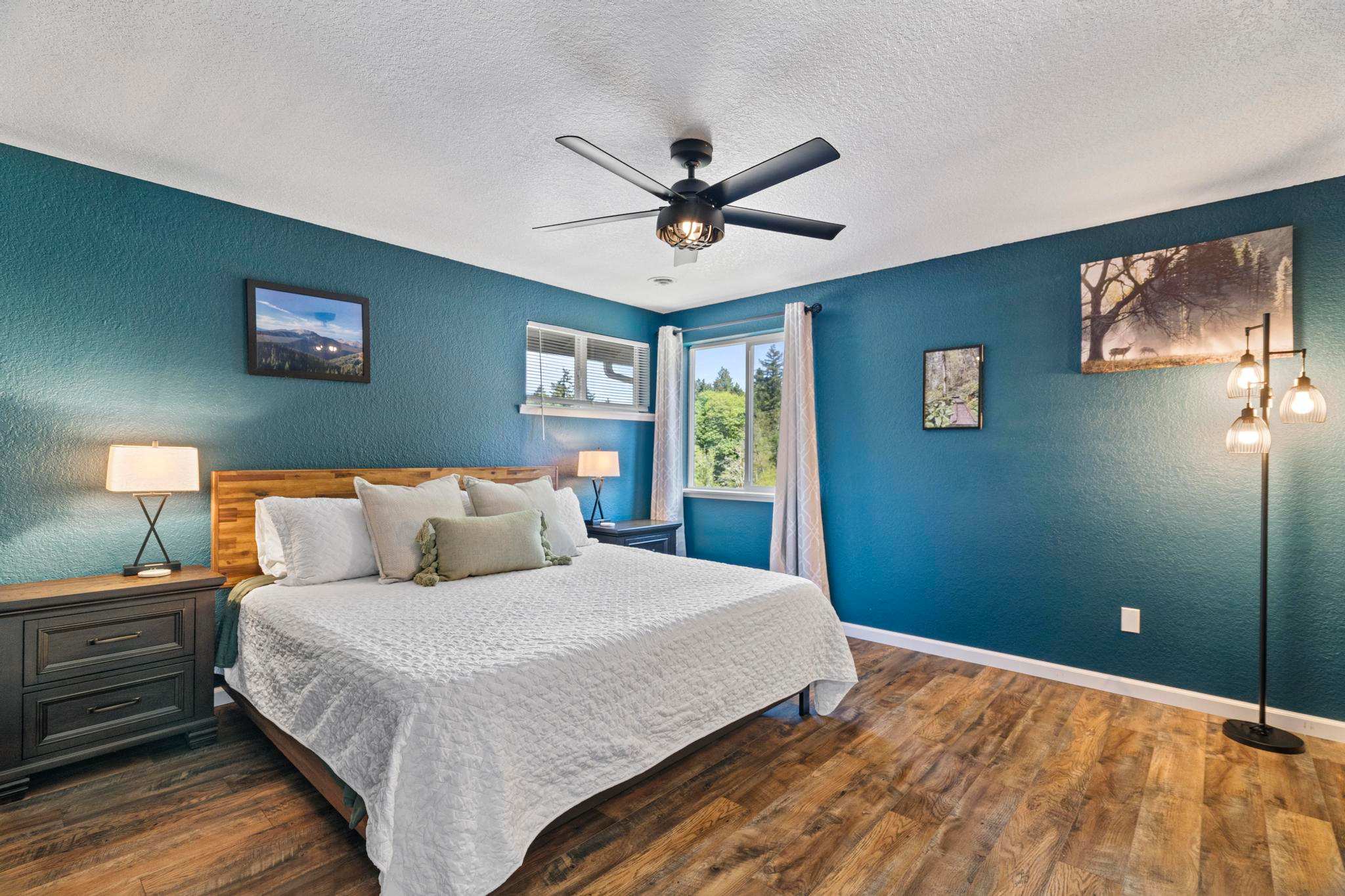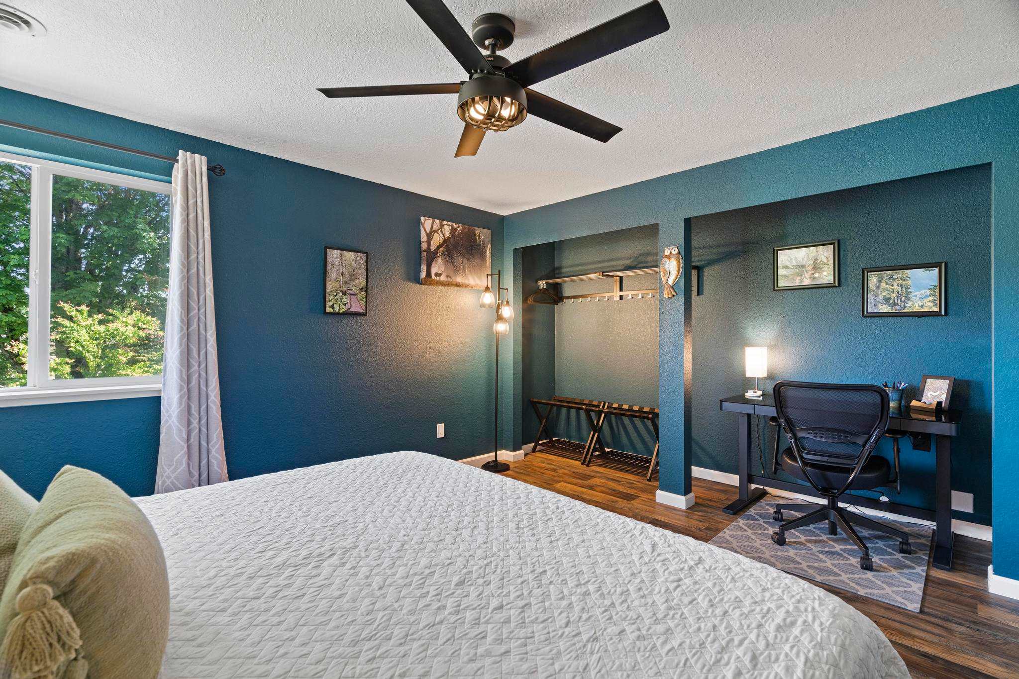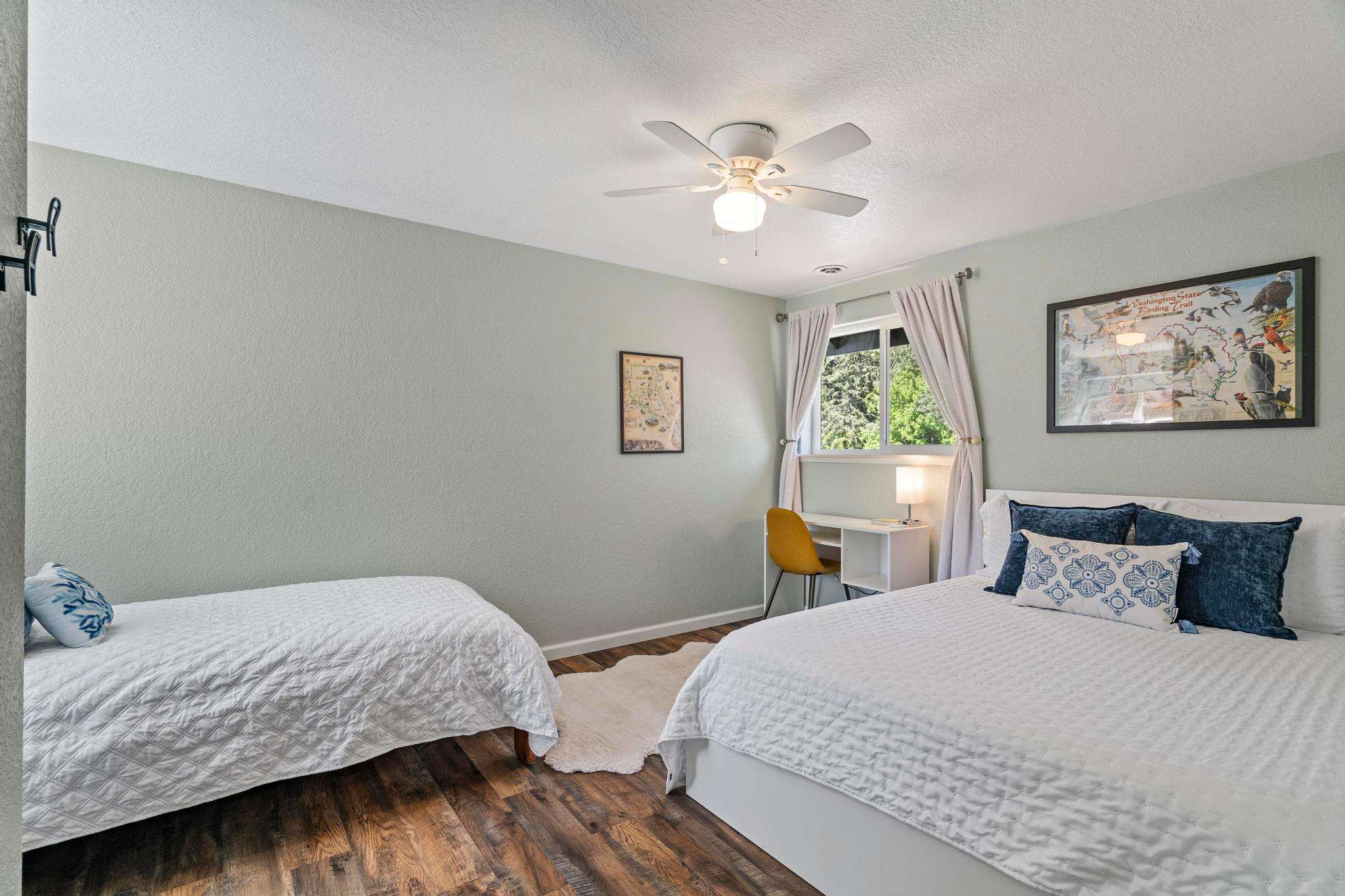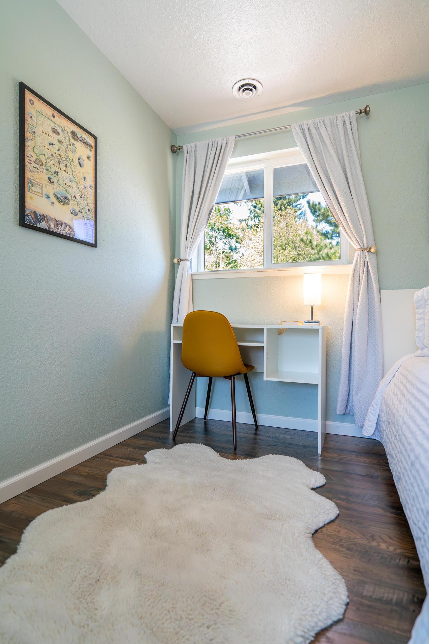 Upstairs, the North Cascades room features a comfortable queen-size memory foam mattress and an extra long twin bed, making it ideal for families or friends traveling together. The master bedroom, the ONP room (short for Olympic National Park), boasts a cozy memory foam king mattress and an adjustable workstation desk for guests who need to work during their stay.