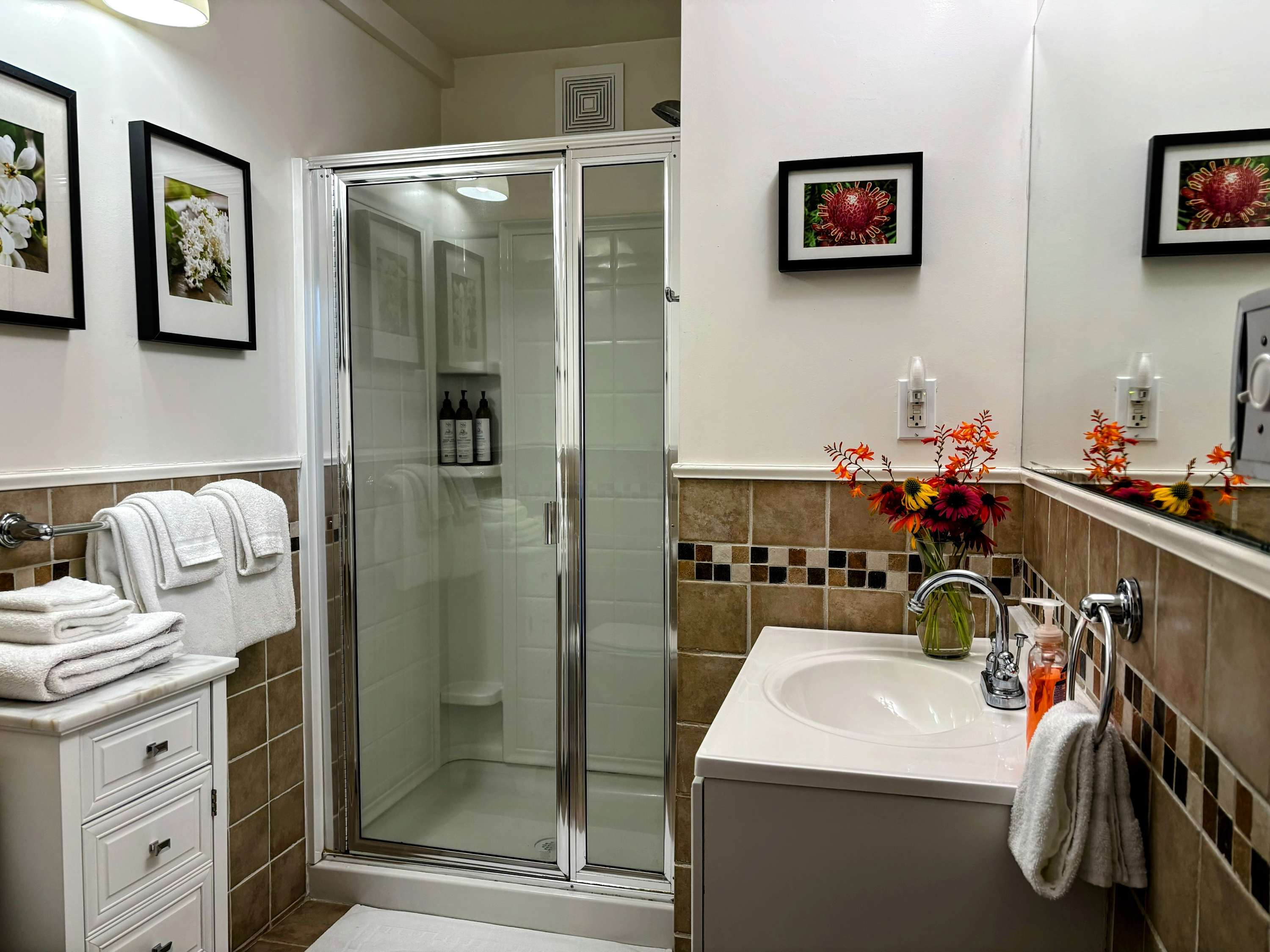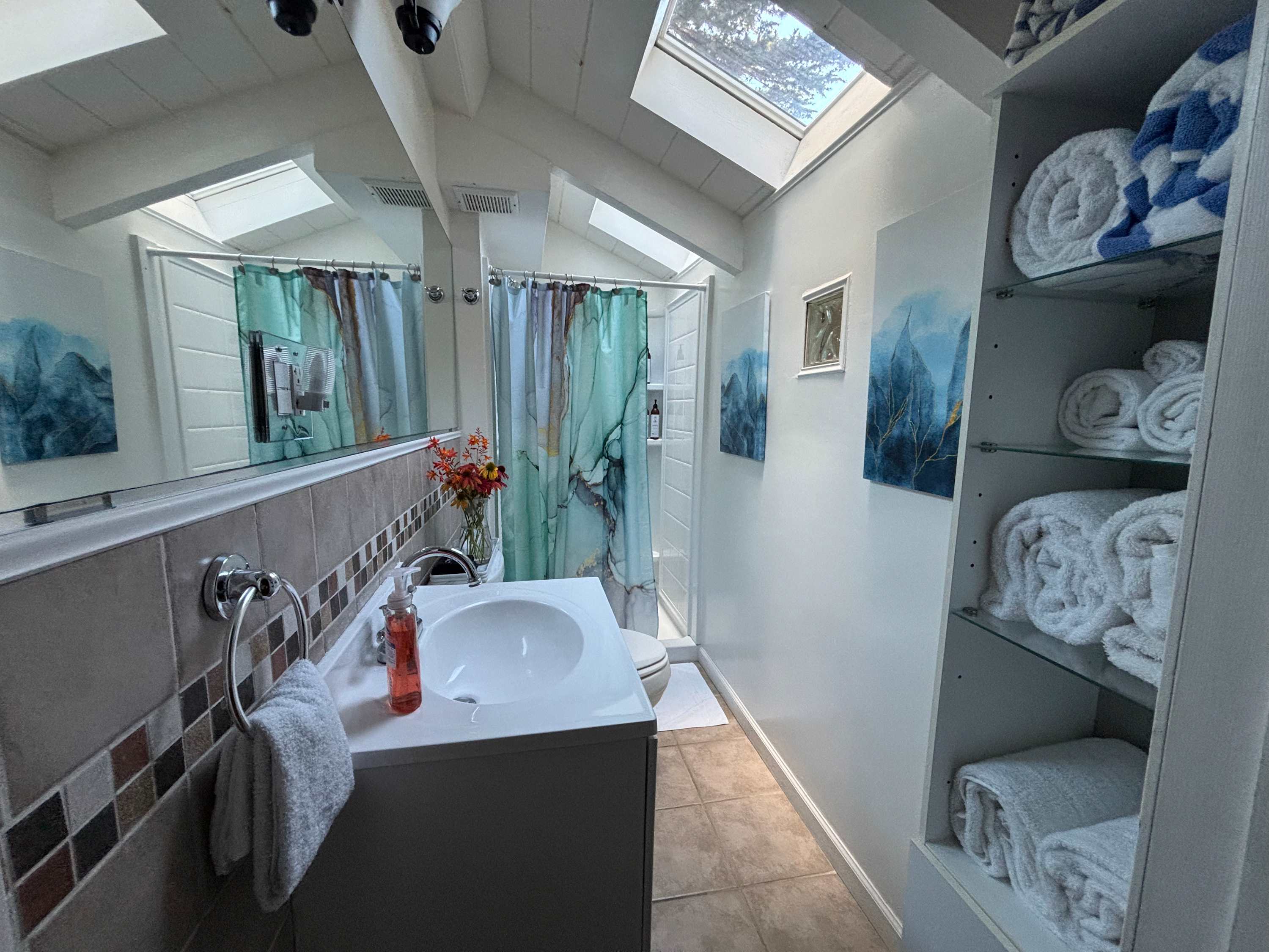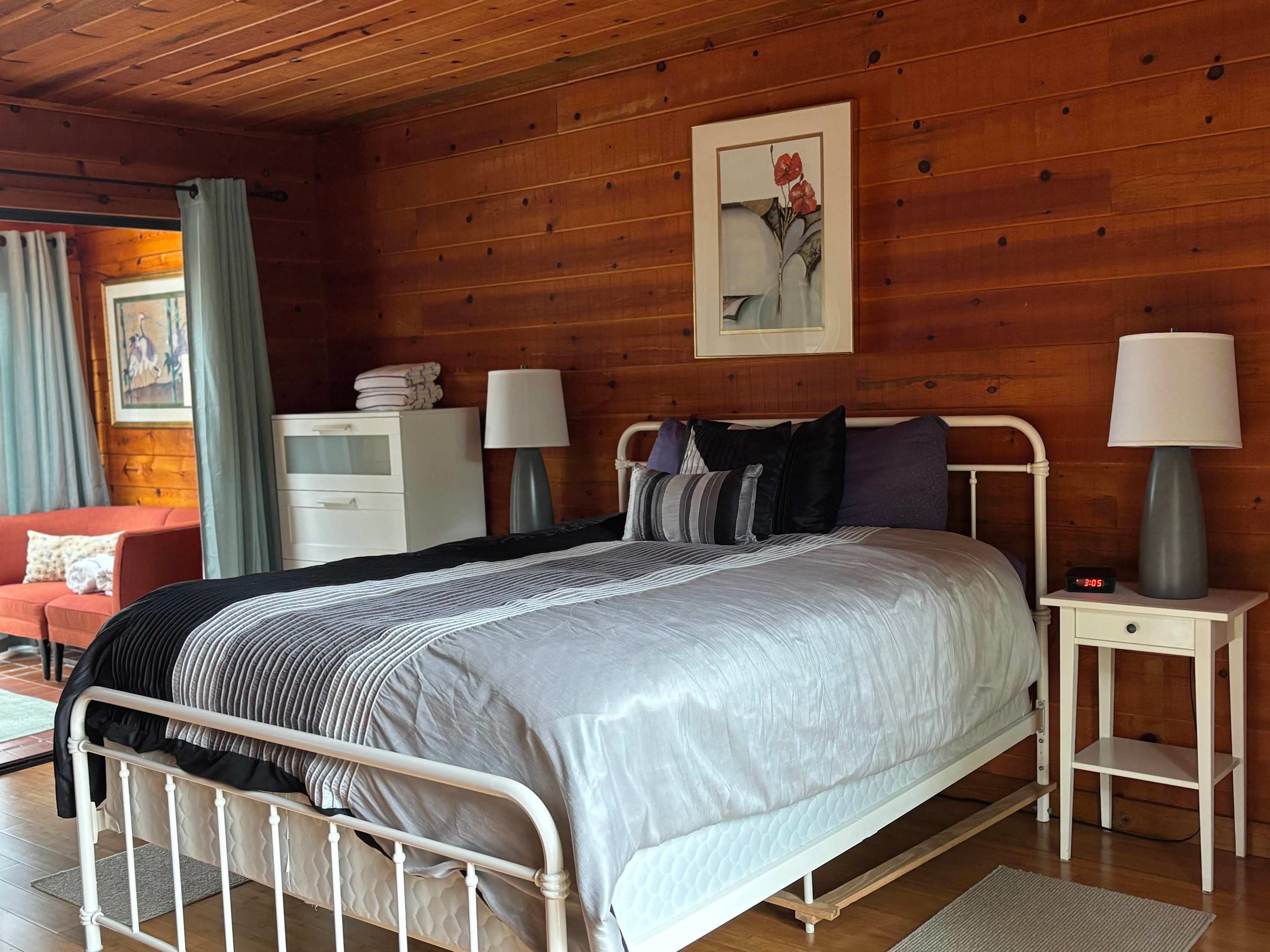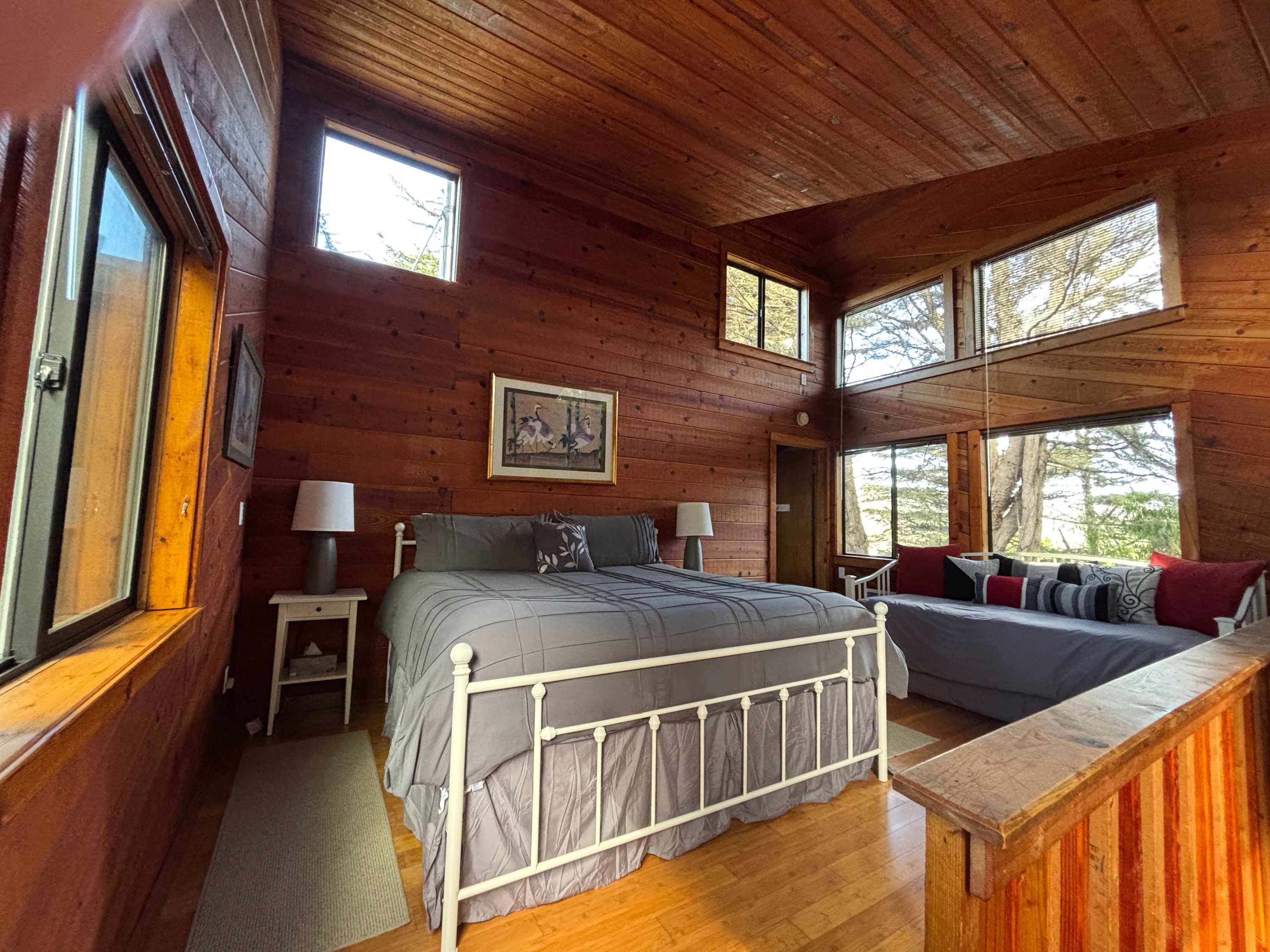 The home features two bedrooms spread across two levels. The downstairs bedroom offers a queen bed and dresser, while the upstairs bedroom includes a king bed, trundle bed, TV, dressing area, and a bathroom with a shower. Guests should note that you must pass through the lower bedroom to access the upper bedroom. While there is no door between the two, there is still a comfortable sense of privacy with them being on separate floors.